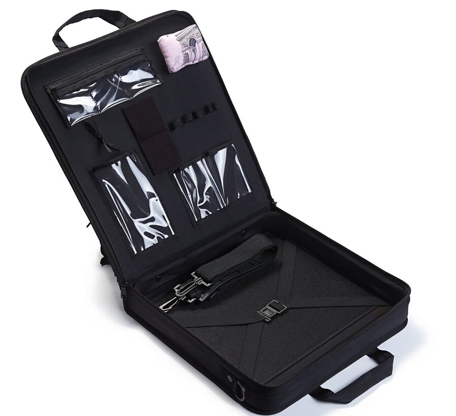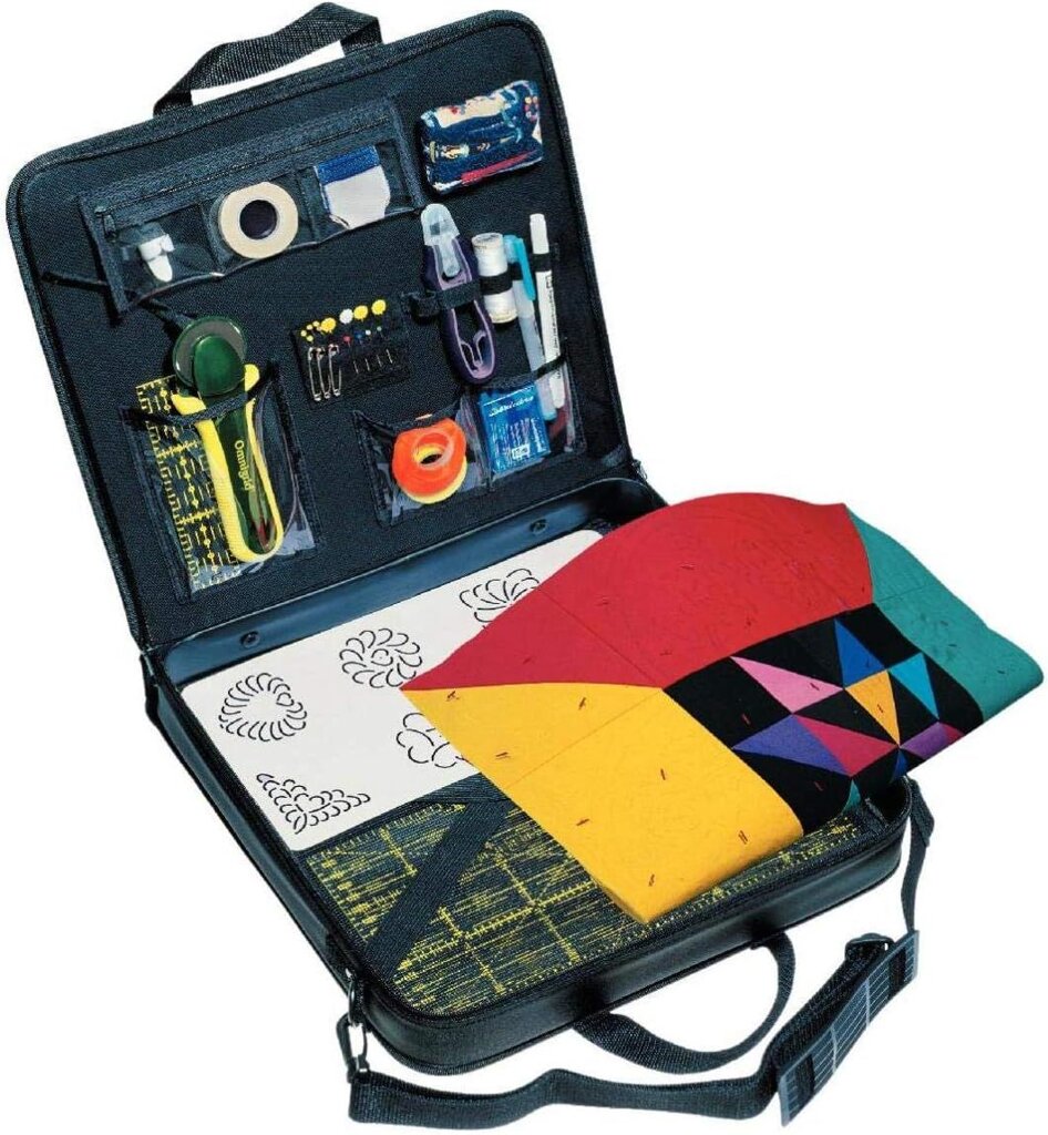 Praktický kufor je ideálny na uloženie všetkých potrieb pre patchwork, či už za účelom praktického skladovania doma alebo pohodlného prenášania na cestách. Kufor ponúka dostatok miesta na uloženie všetkých quiltovacích a patchworkových potrieb vrátane pripravených kúskov látky do veľkosti 32x32 cm. Na vnútornej strane veka je umiestnený praktický ihelníček, tri otvorené vrecká, tri uzatvárateľné vrecká a päť elastických pútok na uloženie cievok nití a ďalších drobností. Kufor má teda dostatok miesta na uloženie kruhového rezača, pravítka, špendlíkov, ihiel i nití. Kufor je vybavený aj popruhmi na zafixovanie kusov látky alebo iných potrieb. Kufor má navyše pevnú vonkajšiu stranu, ktorú môžete využiť ako pracovnú podložku, ako v dielni tak na cestách. Kufra samozrejme nechýba ani praktický popruh na pohodlné prenášanie.