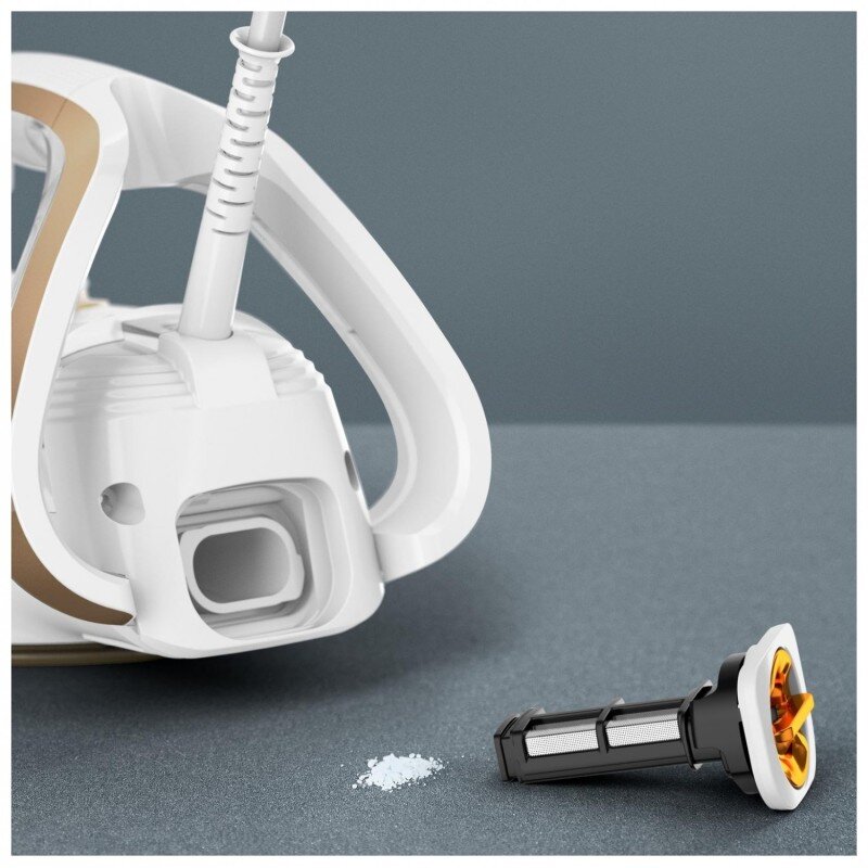 Žehlička má zcela nový unikátní systém proti vodnímu kameni s inovativním filtrem mikročástic, který nabízí účinek 2 v 1: filtr zachycuje vodní kámen a k prádlu se dostane jen čistá pára.