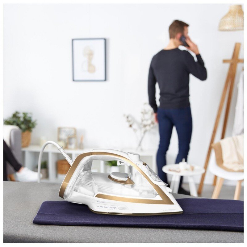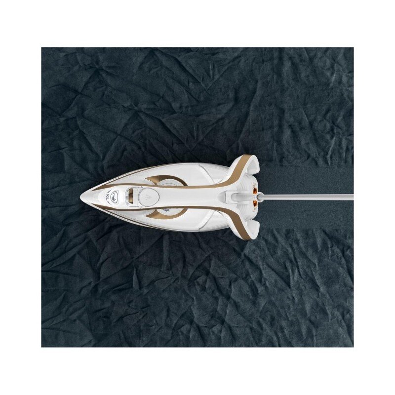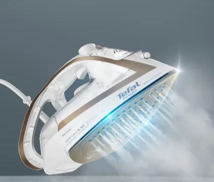 Napařovací žehlička značky Tefal v atraktivní bílé barvě. Žehlička s vysokým parním rázem a kvalitou, která bezstarostně vyžehlí každý záhyb.