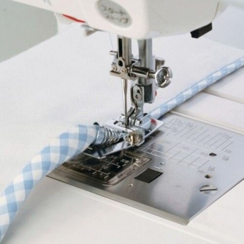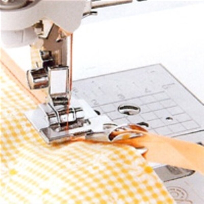 Pätka lemovacia so zakladačom pre lemovku šije atraktívne lemy s použitím bežnej či predhnutej lemovacej textilnej pásky. Táto alternatívna pätka je použiteľná pre šijacie stroje Brother.