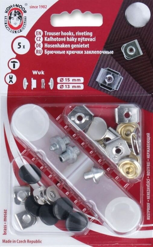 Nohavicový háčik v balení v dvoch priemeroch 15 a 13 mm av dvoch farbách čierna a nikel. Balenie obsahuje celkom 5 kusov nohavicových háčikov.