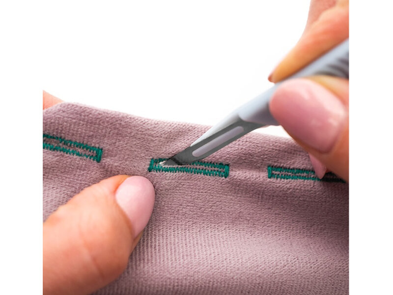 Ostrý nôž, skalpel skvelý pre ľahké rezanie otvorov gombíkových dierok, ktoré vyšijete na svojom šijacom stroji. Vďaka veľmi ostrej a 1 cm dlhej čepeli môžete materiál prerezať s najväčšou presnosťou. Na dokonale presný rez odporúčame umiestniť na konce otvoru svorky.