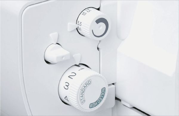 Dĺžka stehu sa ľahko nastavuje pomocou otočného voliča dĺžky stehu a automatického rolovaného lemu. Tento ovládač tiež obsahuje nastavenia pre rolované a veľmi úzke stehy, ktorý zasunie vstavaný stehový prst.