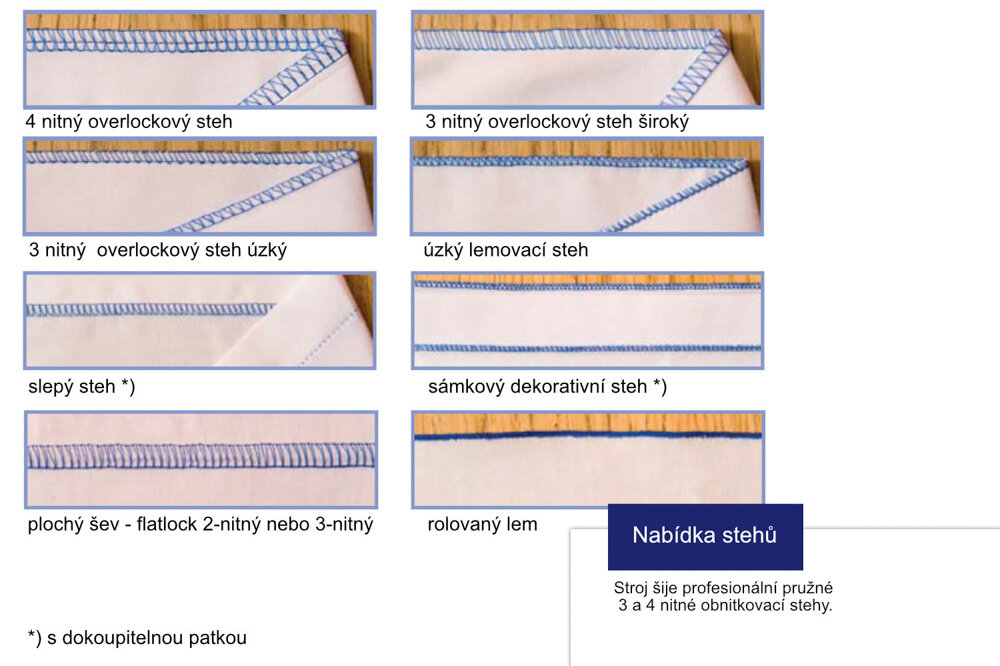- Objednajte si súčasne kvalitné a napriek tomu cenovo výhodné overlockové nite v 5000 m návinoch a ihly vhodné pre tento overlock (každú farbu nití po 4 ks, pretože sa jedná o 4-nitný overlock).