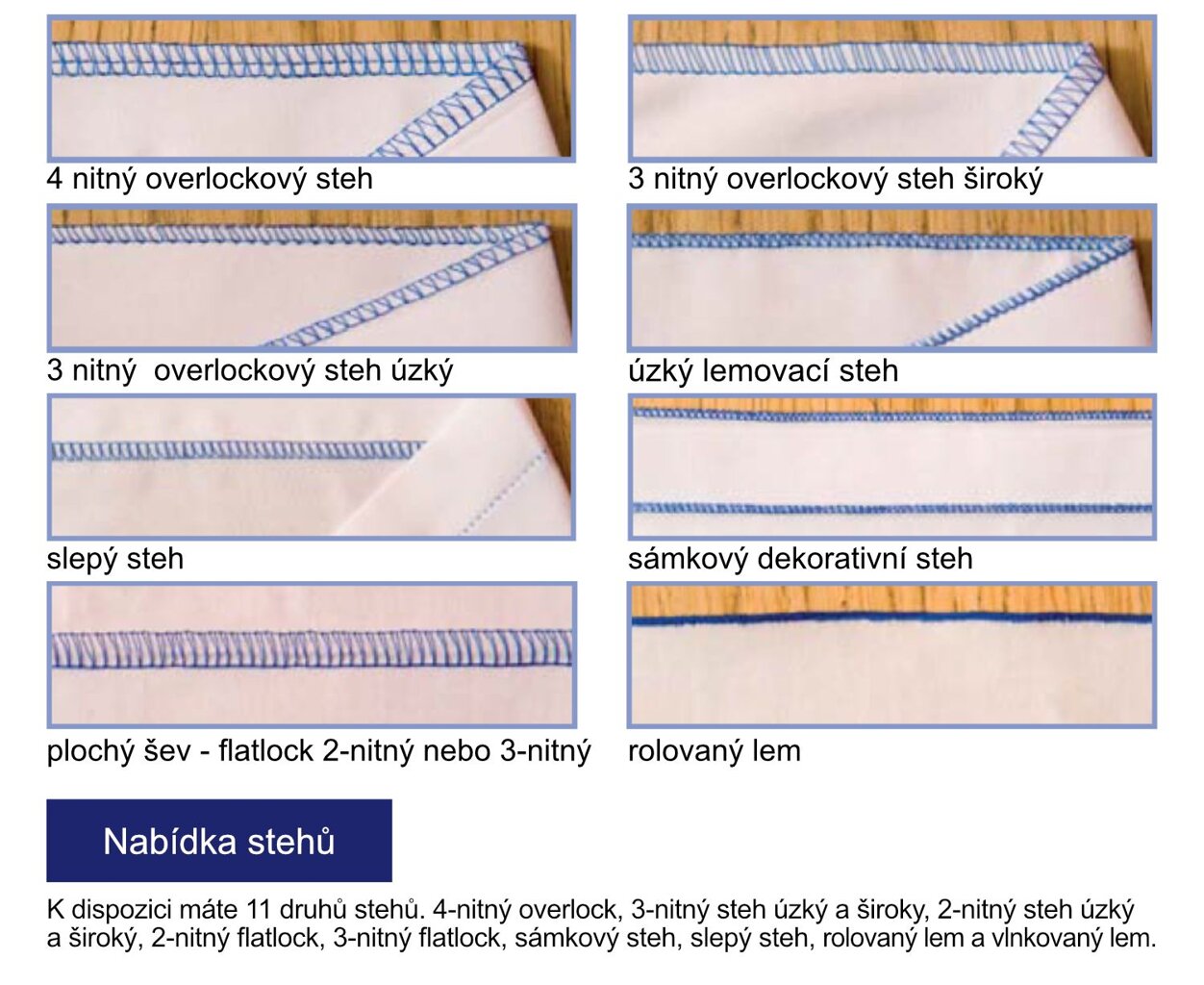 - zámikový steh, slepý steh, rolovaný lem, vlnkovaný lem.