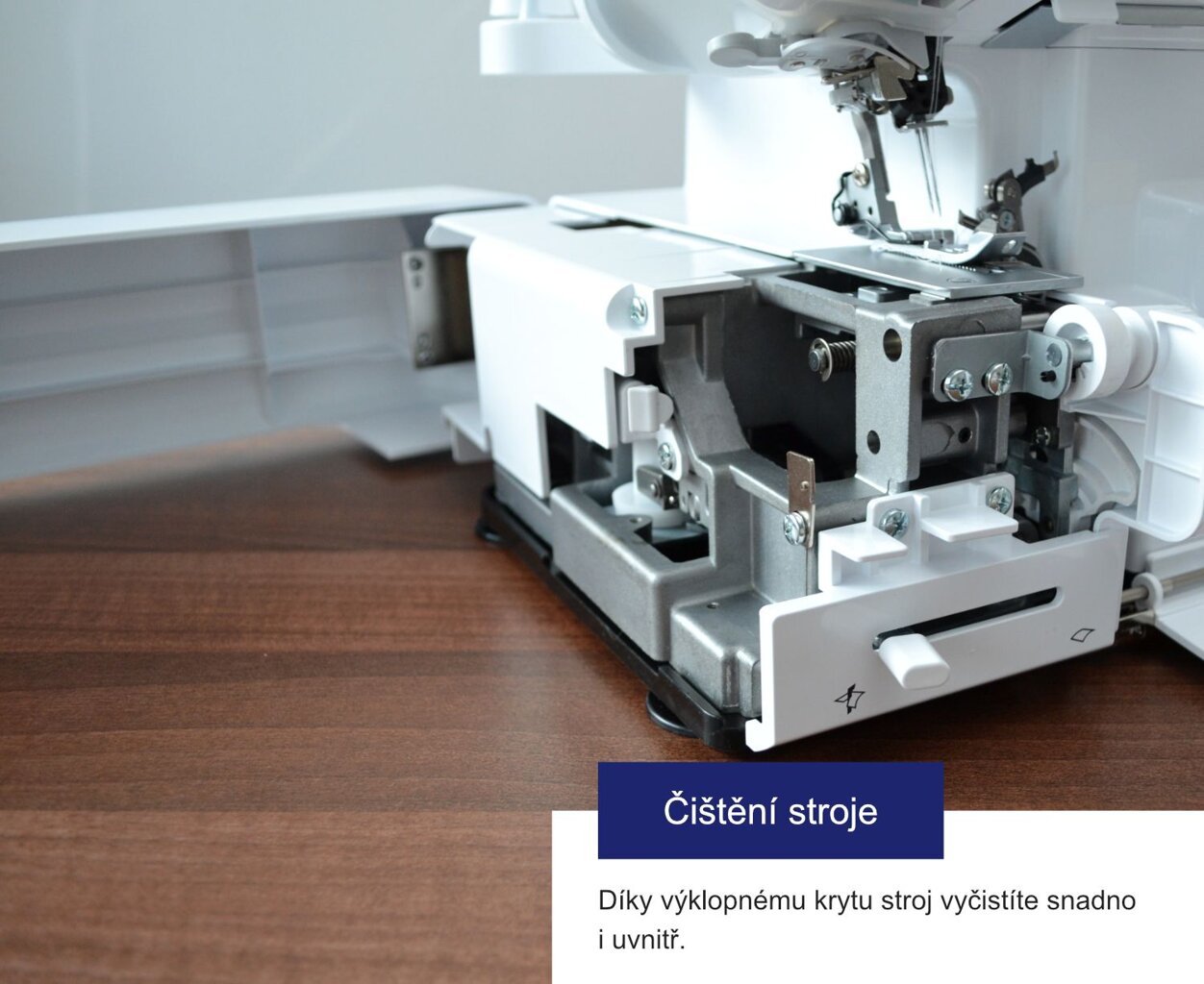 - Veľký priestor na šitie, ktorý sa dá rozšíriť dokúpiteľným stolíkom.