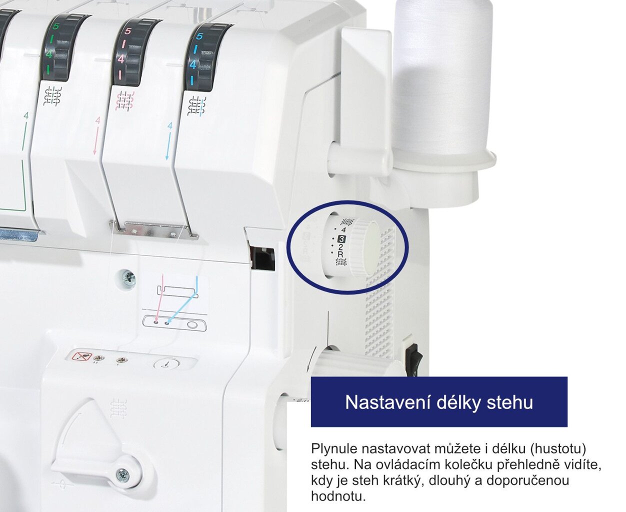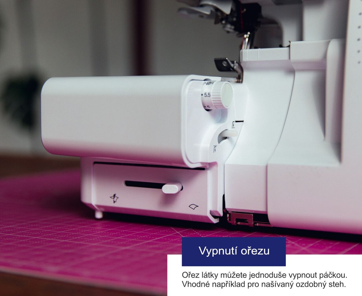 - Otočný ovládač pre šírku orezu a hustotu stehu - nastavenie šírky 5 - 7.5 mm