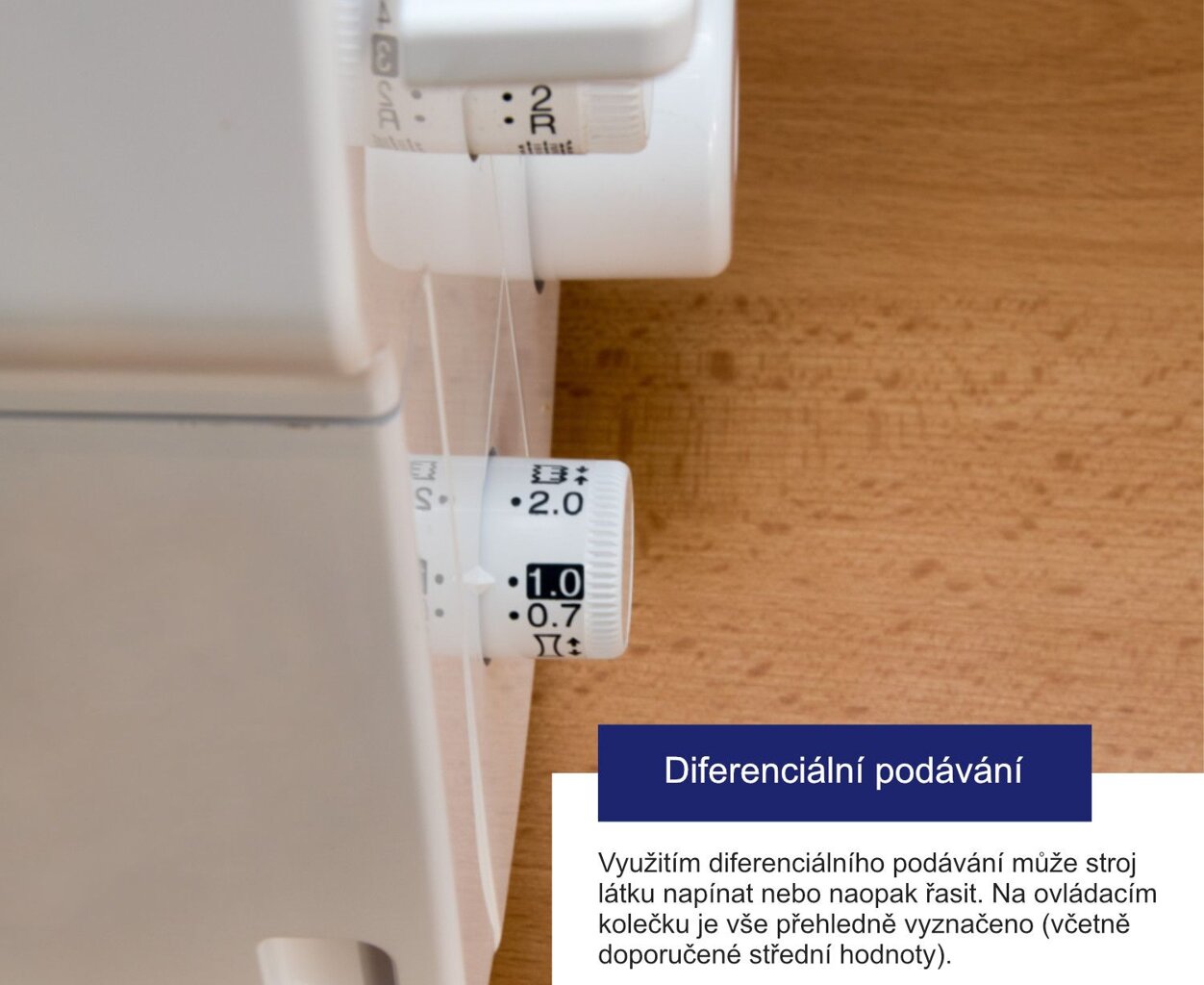 - Diferenciálne podávanie deleným podávačom umožňuje dokonalé šitie bez zvlnenia či nadmerného riasenia švu akejkoľvek látky
