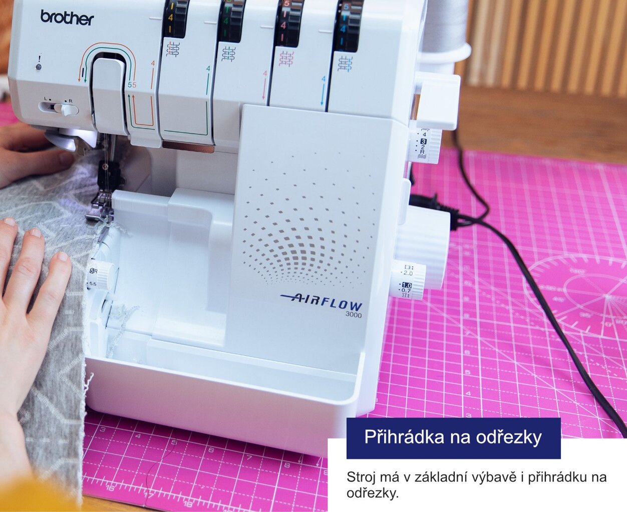 Overlock Brother Airflow 3000 je novinkou od značky Brother, prvý overlock navliekaný vzduchom navyše s úplne precíznym šitím na najrôznejších materiáloch.