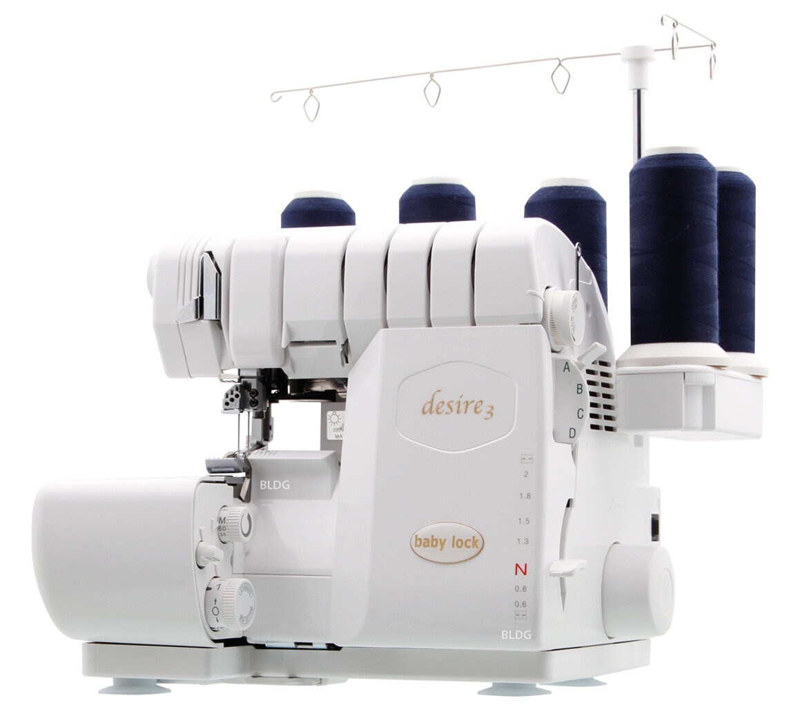 Overlock - coverlock Baby Lock Desire je 2,3,4 a 5-nitný overlock, ktorý zvláda overlockové aj coverlockové - bielizňové stehy alebo ich kombináciu. Patentované automatické napínanie nití.