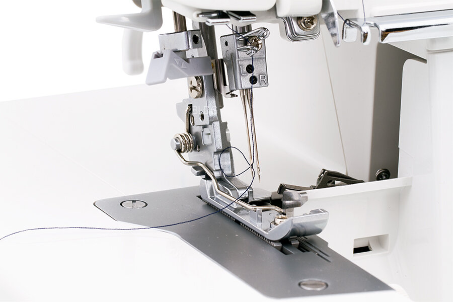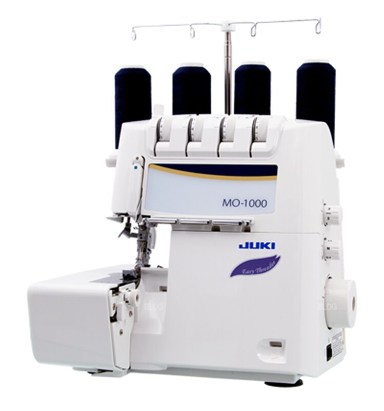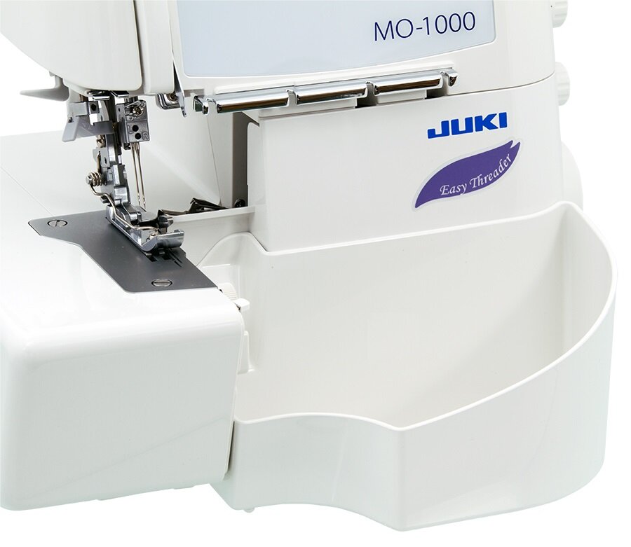Overlock Juki MO - 1000 je mimoriadne kvalitný 2, 3 a 4-nitný 2-ihlový overlock pre domácnosť so vzduchovým navliekaním slučkovačov, diferenciálnym podávaním látky, automatickým rolovaným lemom a silným orezovým systémom.