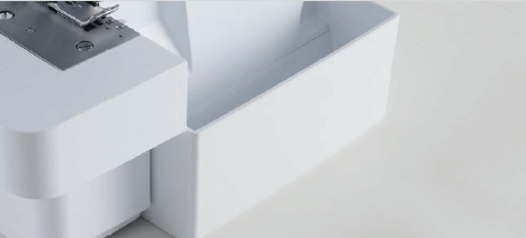 - Jednoduchá tvorba rolovaného lemu pomocou vstavaného tlačidla u stehovej dosky stroja. Vďaka tejto funkcii nie je potrebné meniť pätku alebo základnú dosku.