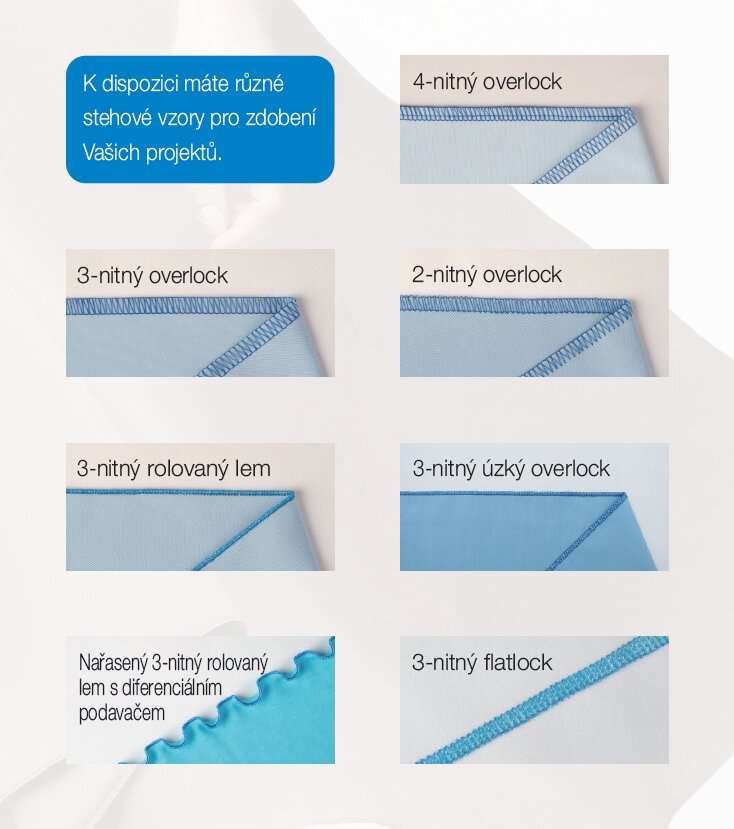 - Regulácia šírky stehu alebo šírky orezu v rozmedzí do 6 mm (rolovaný lem 2 mm)