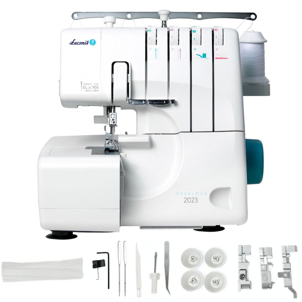 Lucznik 2023 je dvou, tří až čtyřnitný overlock s volným ramenem, diferenciálním podáváním, regulovatelným přítlakem patky, nádobkou na odřezky a širokou výbavou.