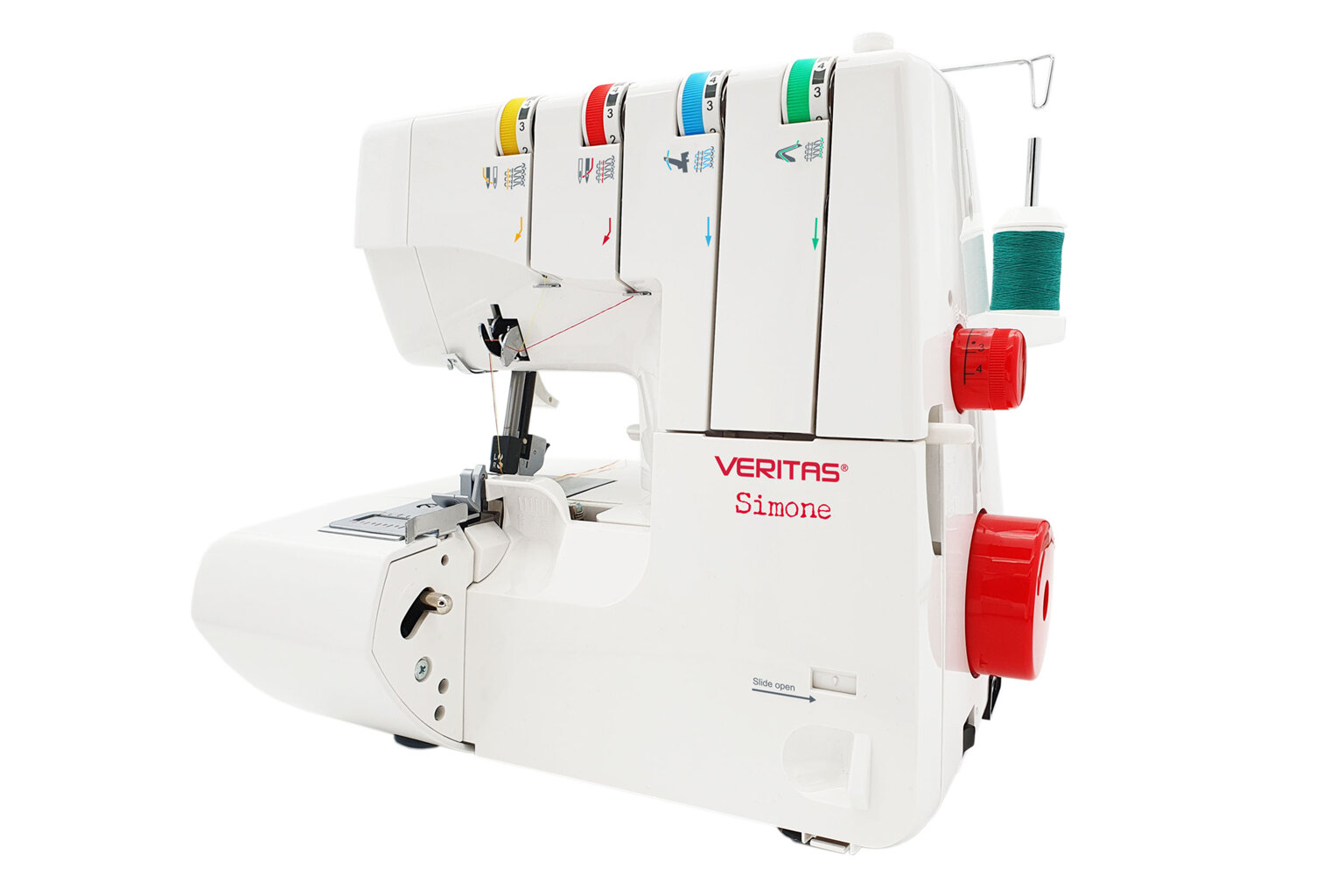 Dôležité vlastnosti: Overlock Veritas Simone je 2, 3 a 4-nitný pomocník so silným orezovým systémom. Overlock má diferenciálne podávanie, ktoré je možné pohodlne regulovať a zaručuje rovnomerné podávanie aj veľmi pružných materiálov. Farebné značenie navliekacích dráh, je praktickým pomocníkom pri navliekaní stroja. Stroj ponúka aj možnosť vypnutia orezu.