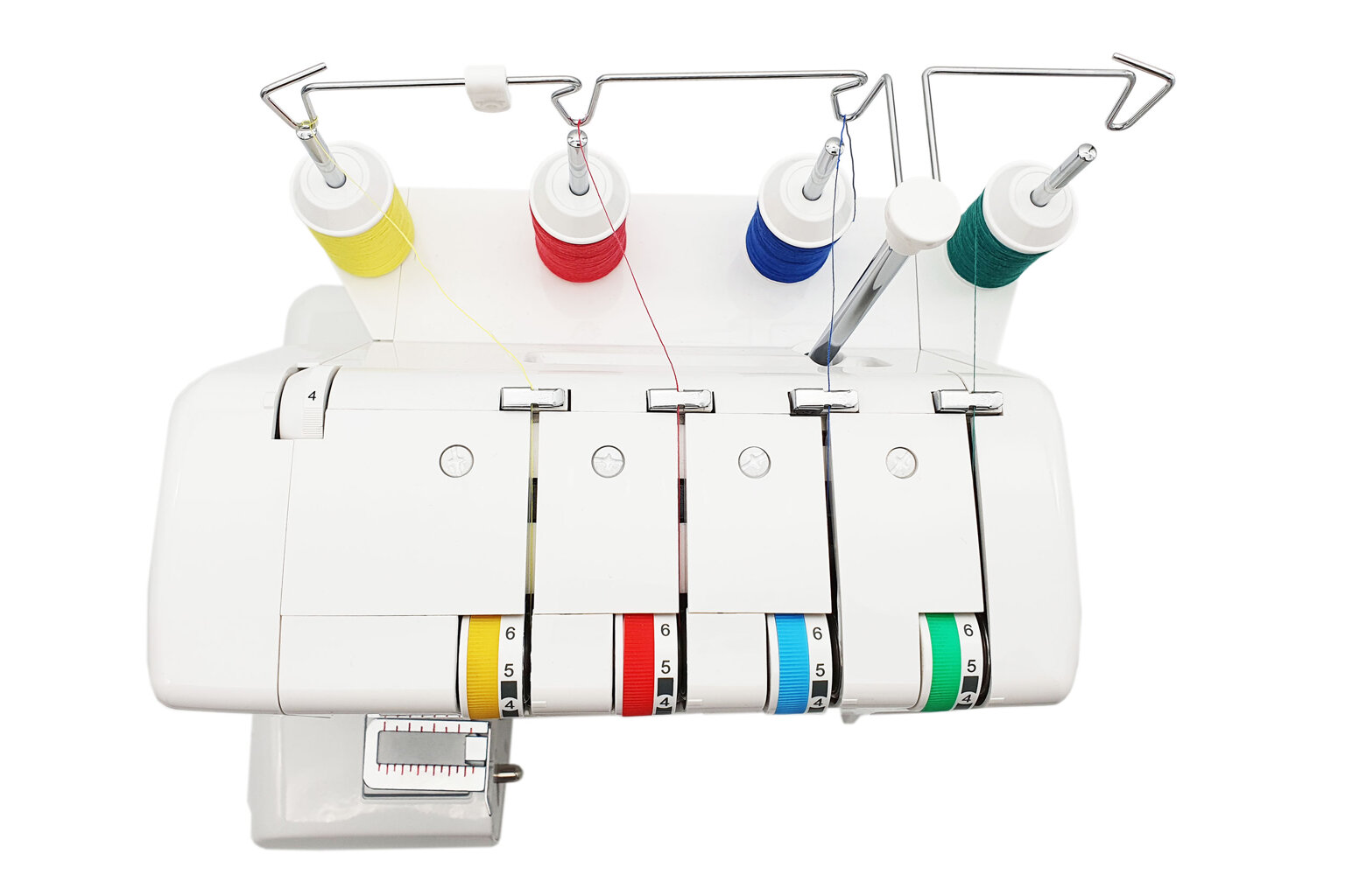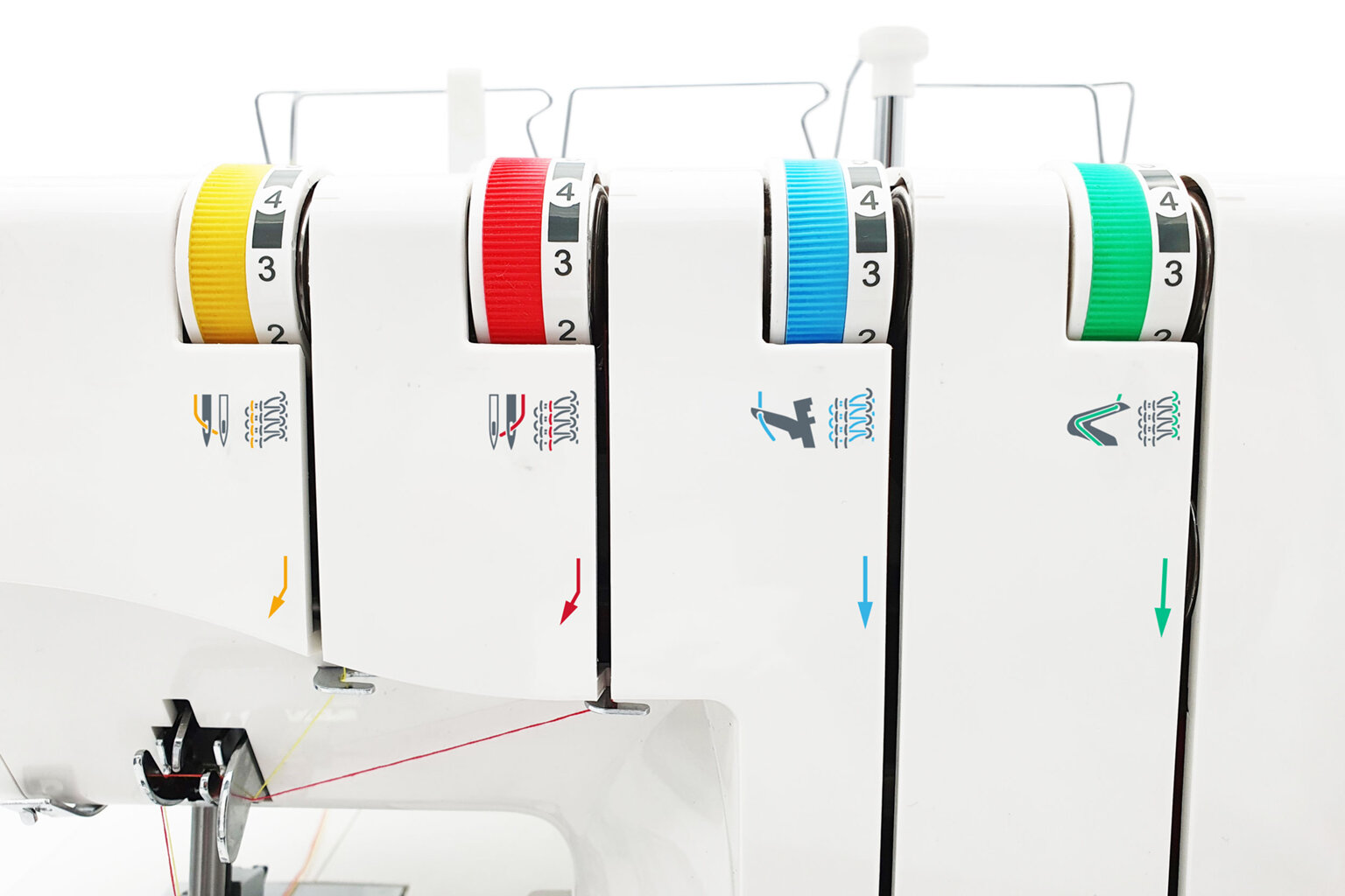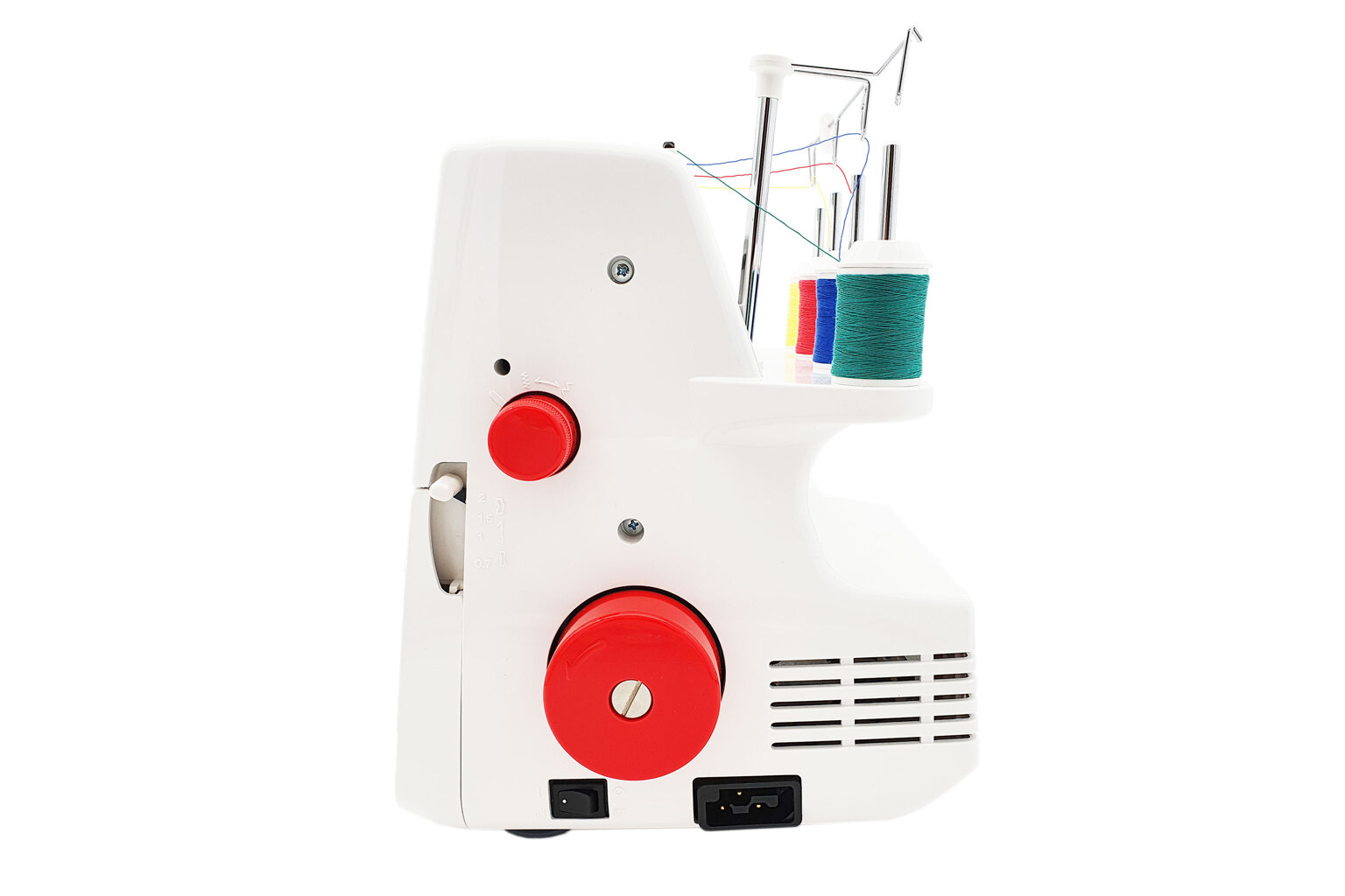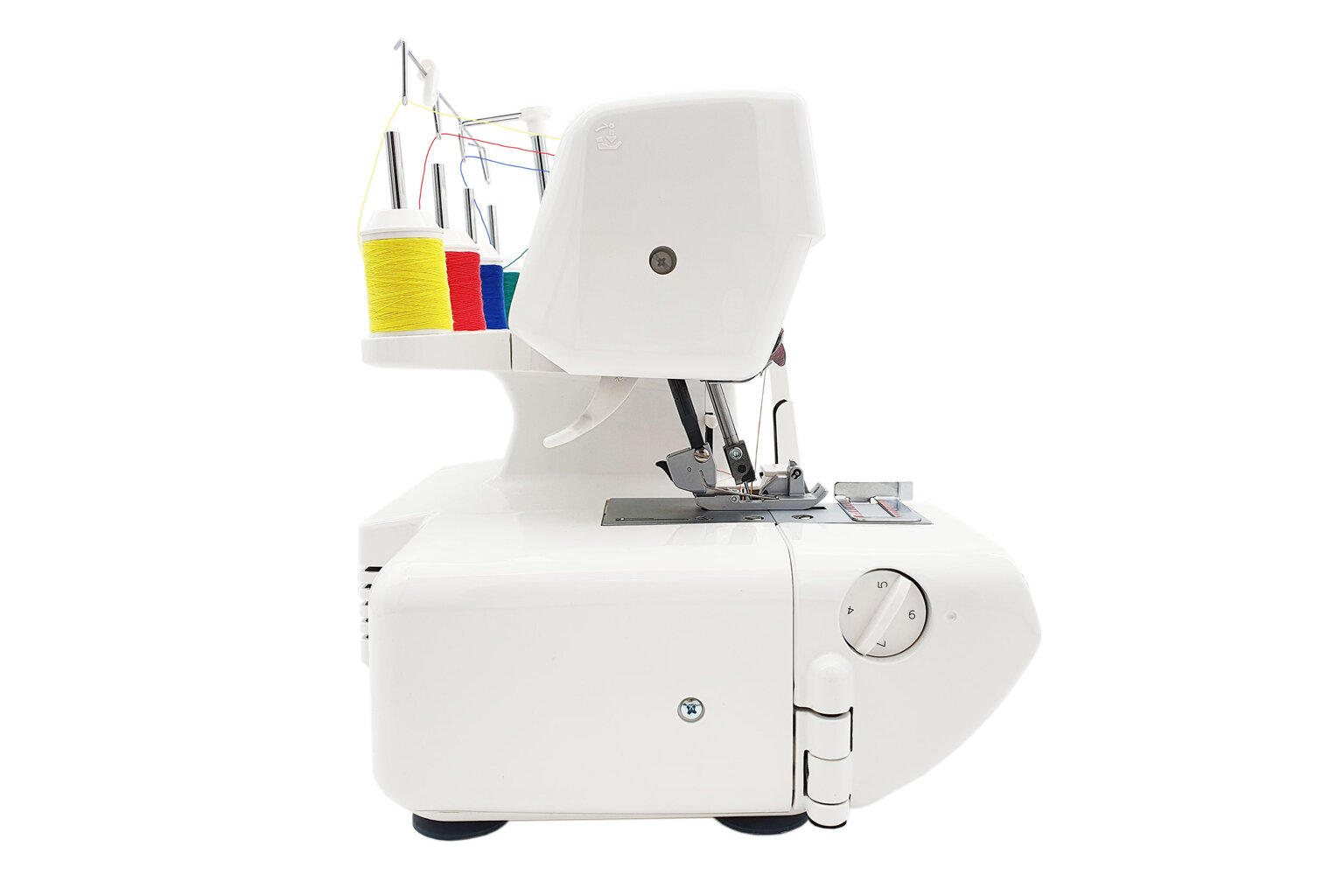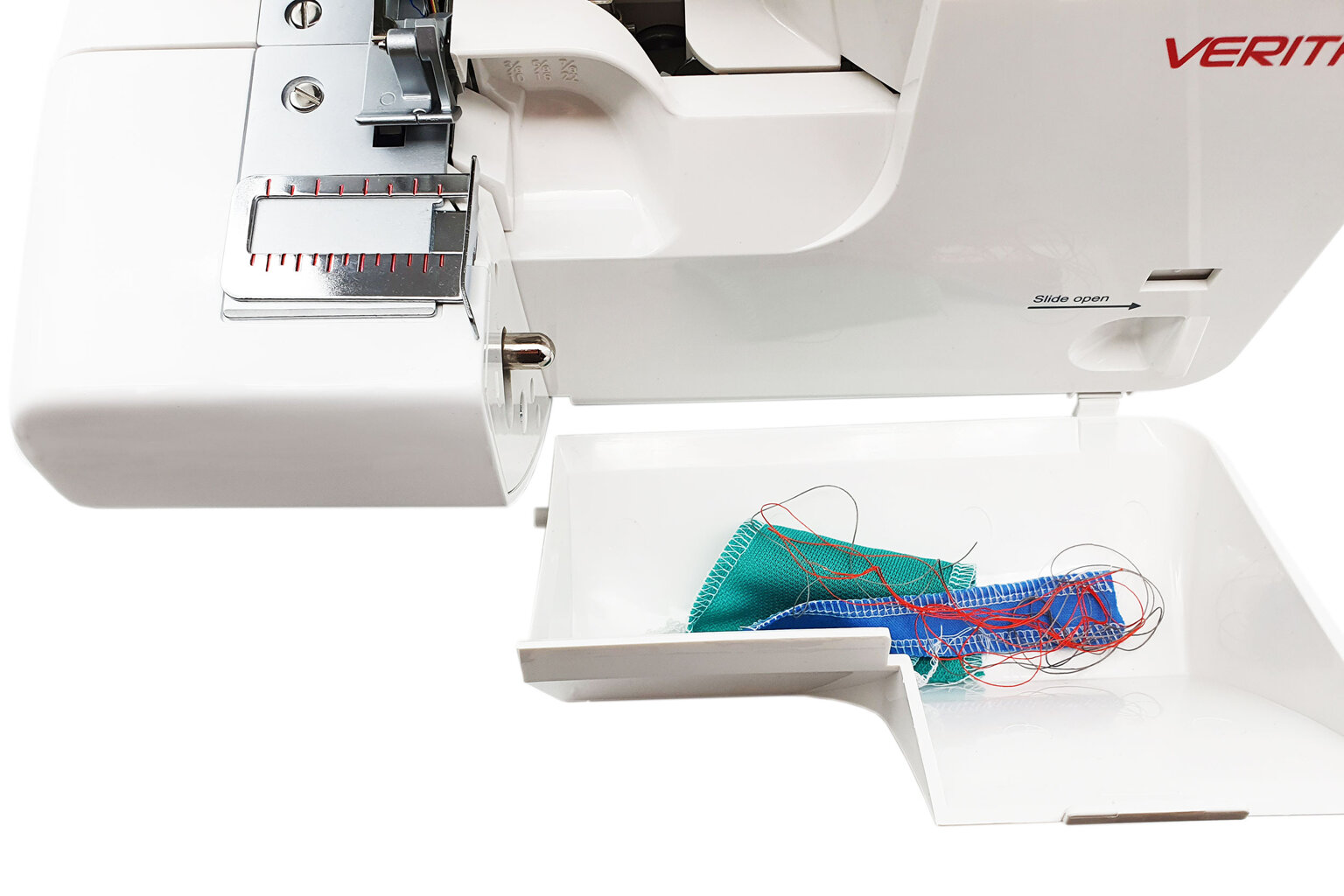Overlock Veritas Simone je kvalitný 2, 3 a 4-nitný 2-ihlový overlock s diferenciálnym podávaním látky, automatickým rolovaným lemom, navliekačom ľavého slučkovača a silným orezovým systémom.