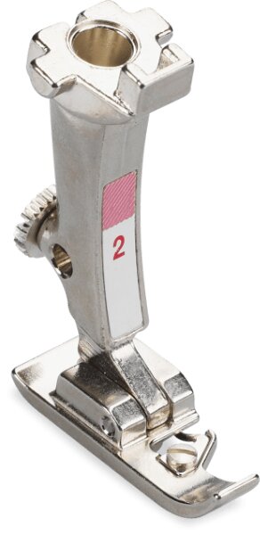 Overlocková pätka č. 2 je určená predovšetkým na zošívanie a začisťovanie švov a lemov. Najmä sa hodí na začisťovanie jednoduchých švov, to všetko bez použitia overlocku. Táto pätka predchádza zhrňovaniu látky a vytvára plochý pružný šev. Overlockovú pätku môžete použiť aj pre vysoko kvalitné lemy, pasy a overlockové švy na úpletoch.