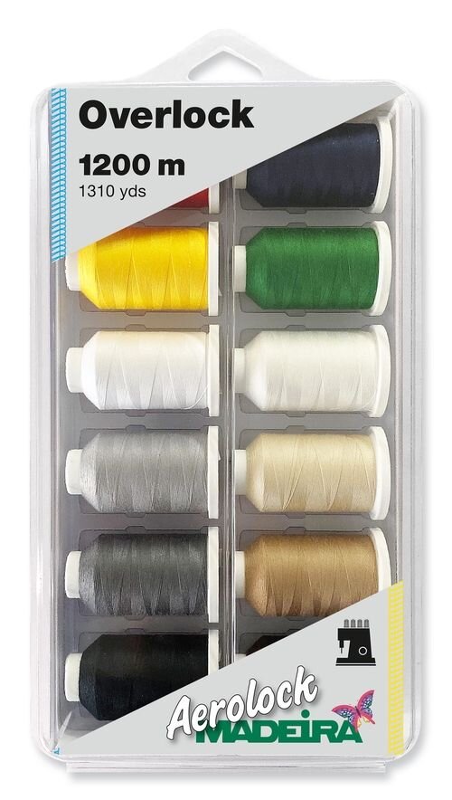 Overlockové nite PES Madeira Aerolock 125 (12x1200m) je sada polyesterových overlockových nití v boxe.