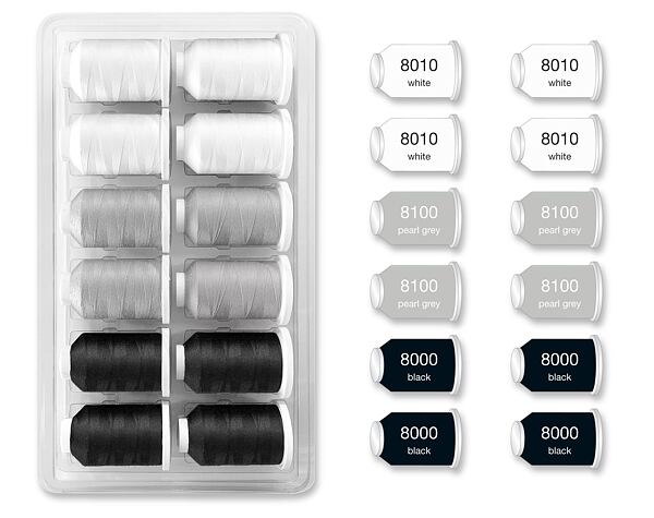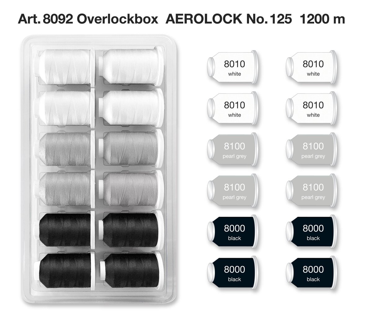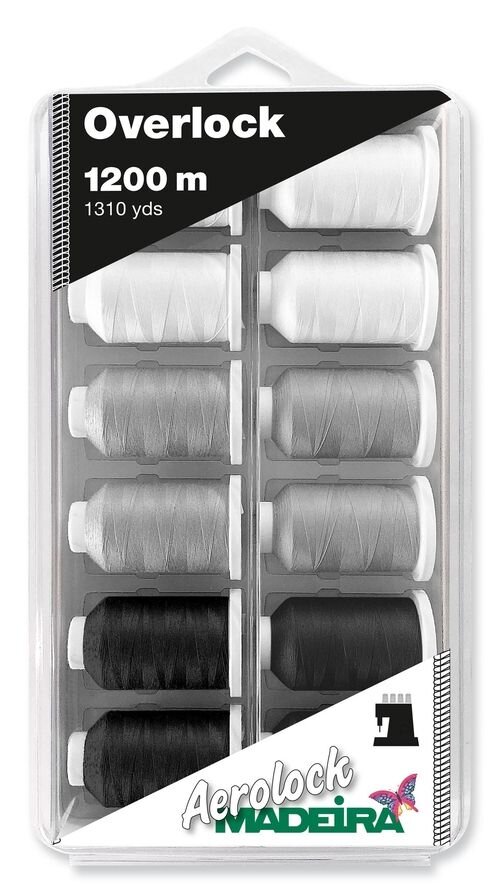 Overlockové nite PES Madeira Aerolock 125 - jednofarebné (12x1200m) je sada čiernobielych polyesterových overlockových nití v boxe. Prémiová kvalita pre domáce overlocky.