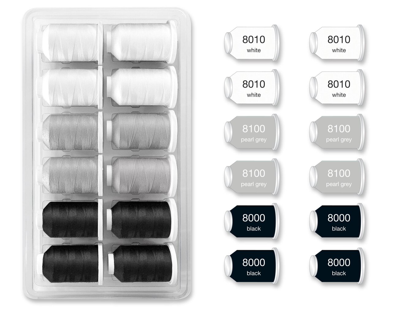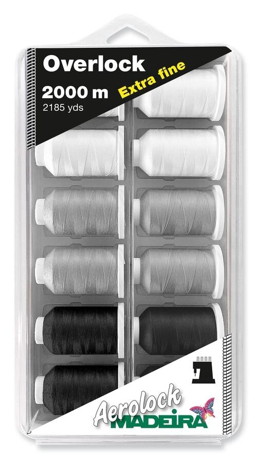 Overlockové nite PES Madeira Aerolock 180 - jednofarebné (12x2000m) je sada čiernobielych polyesterových overlockových nití v boxe. Prémiová kvalita na šitie na domácom overlocku.