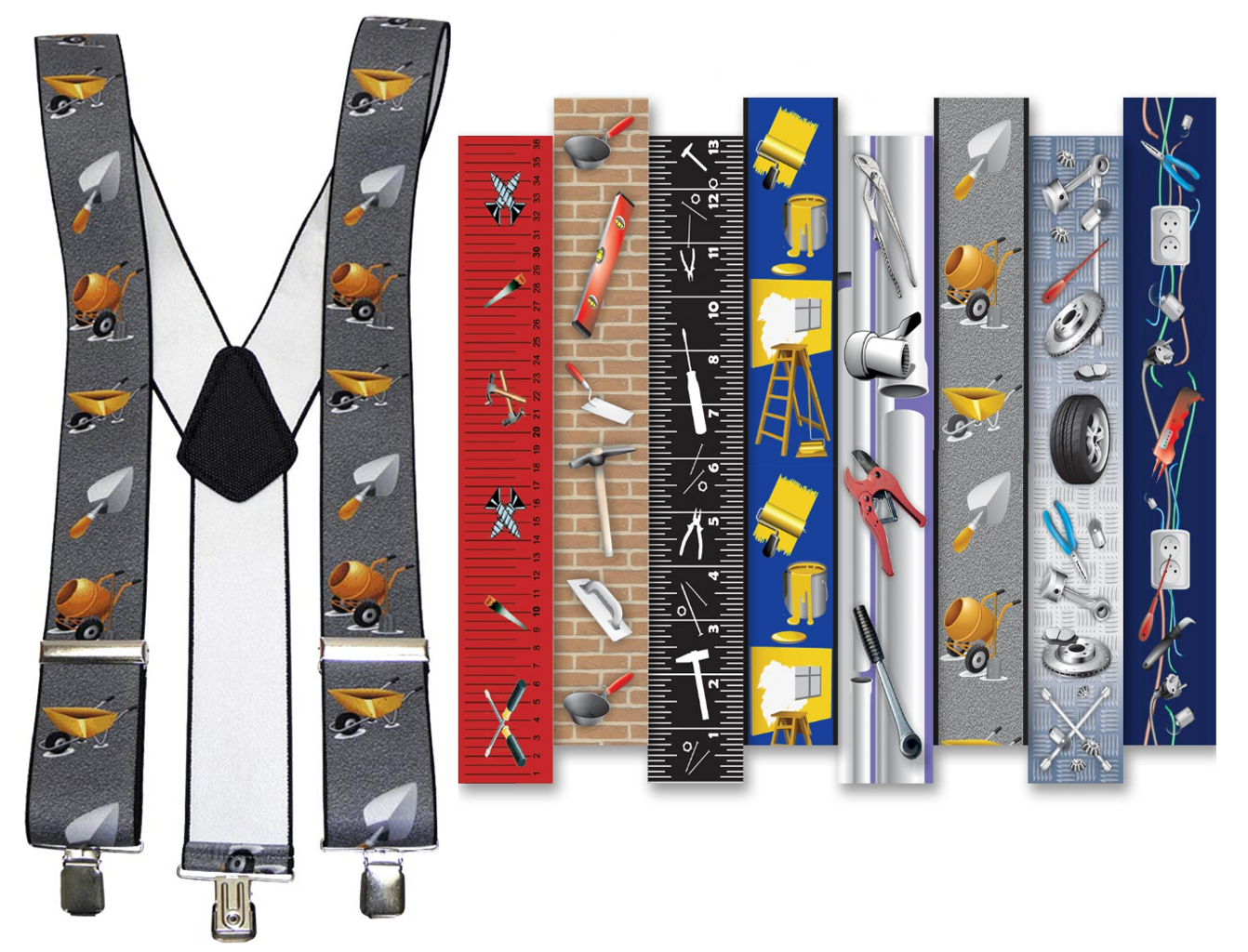 Štýlové pánske traky s potlačou sa budú skvele vynímať na Vašom oblečení. Traky majú remeselnícku potlač a sú tak skvelé pre bežné nosenie, do práce a veľmi potešia aj ako darček vášnivého stavára. Traky majú šírku 5 cm a sú opatrené tromi závesmi - tvar Y. Sú určené na výšku postavy až 180 cm, ich maximálna dĺžka v napnutom stave je 120 cm. Majú uchytenie na kovovú klipsu, čo je veľmi praktické. Traky môžete uchytiť na nohavice, kraťasy aj sukňu.
