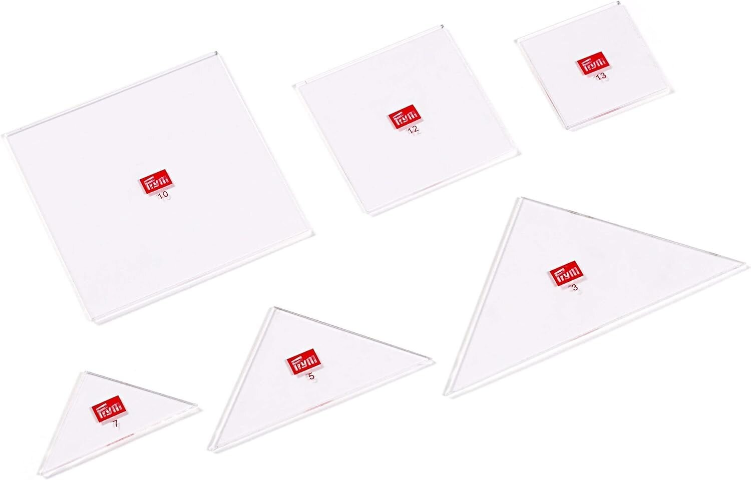 Sada obsahuje 6 kusov šablón na tvorbu 10 rôznych patchworkových vzorov. Šablóny v tvare štvorca a trojuholníka v rôznych veľkostiach.