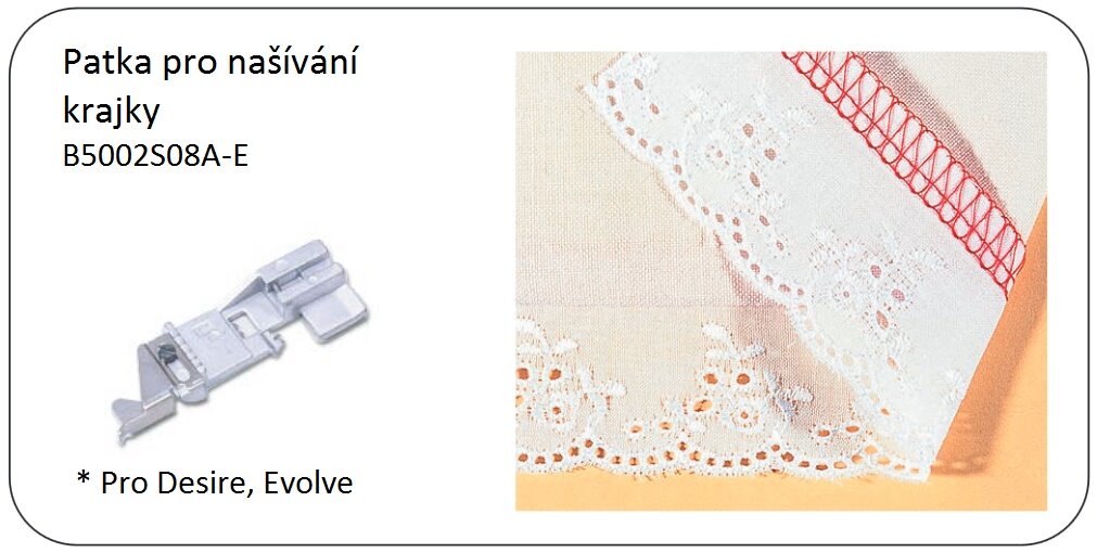 Pätka na našívanie čipky - Baby Lock Primo, Desire, Ovation, Gloria, Euphoria je pätka, ktorú je možné dokúpiť pre c/overlocky Baby Lock Desire BLE 5, Evolve, Ovation a Gloria, Euphoria BLC4. Táto pätka umožňuje prišívanie čipky.