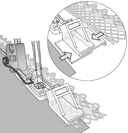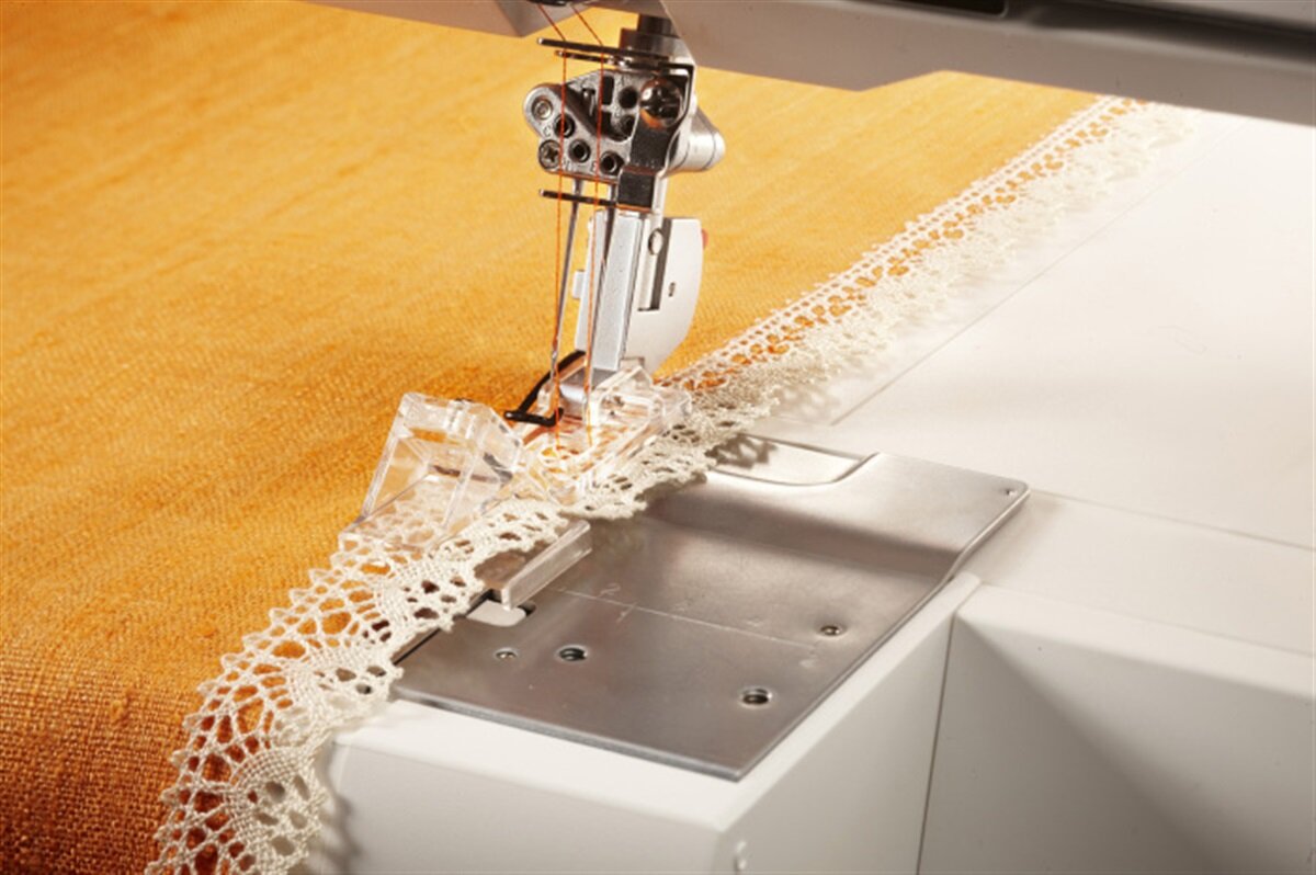 Pätka pre ploché lemovanie - coverlocky Pfaff je voliteľné príslušenstvo, ktoré je možné dokúpiť pre coverlocky Pfaff 3.0 a 4.0. Pätka sa používa na našívanie čipky alebo pásky bielizňovým stehom.