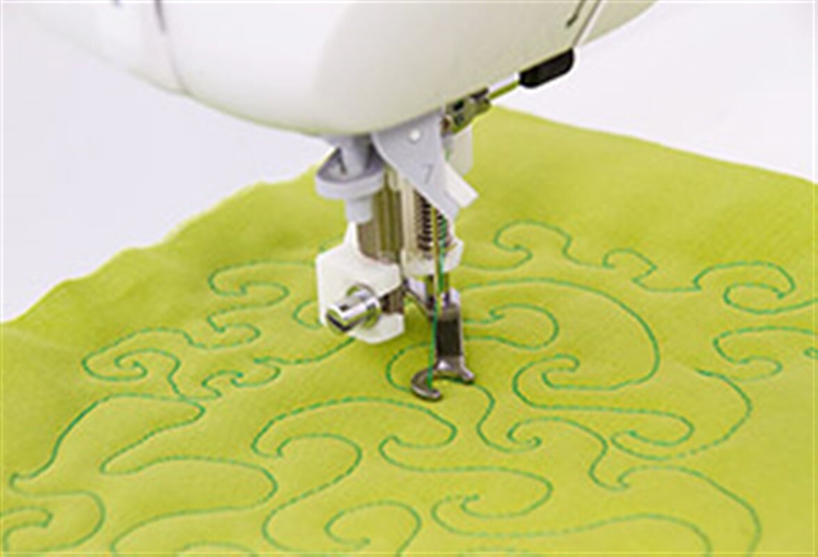 Pätka na voľné quiltovanie otvorená - Juki rad F, G, DX je voliteľné príslušenstvo, ktoré je možné dokúpiť pre šijacie stroje Juki HZL radu F, G a DX. Pätka sa používa na prešívanie voľným pohybom, látanie aj vyšívanie.