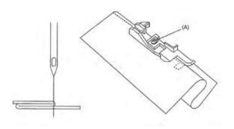 2. Povoľte skrutku (A) a nastavte vodítko okraja tak, aby ihla prenikala do látky u preloženého