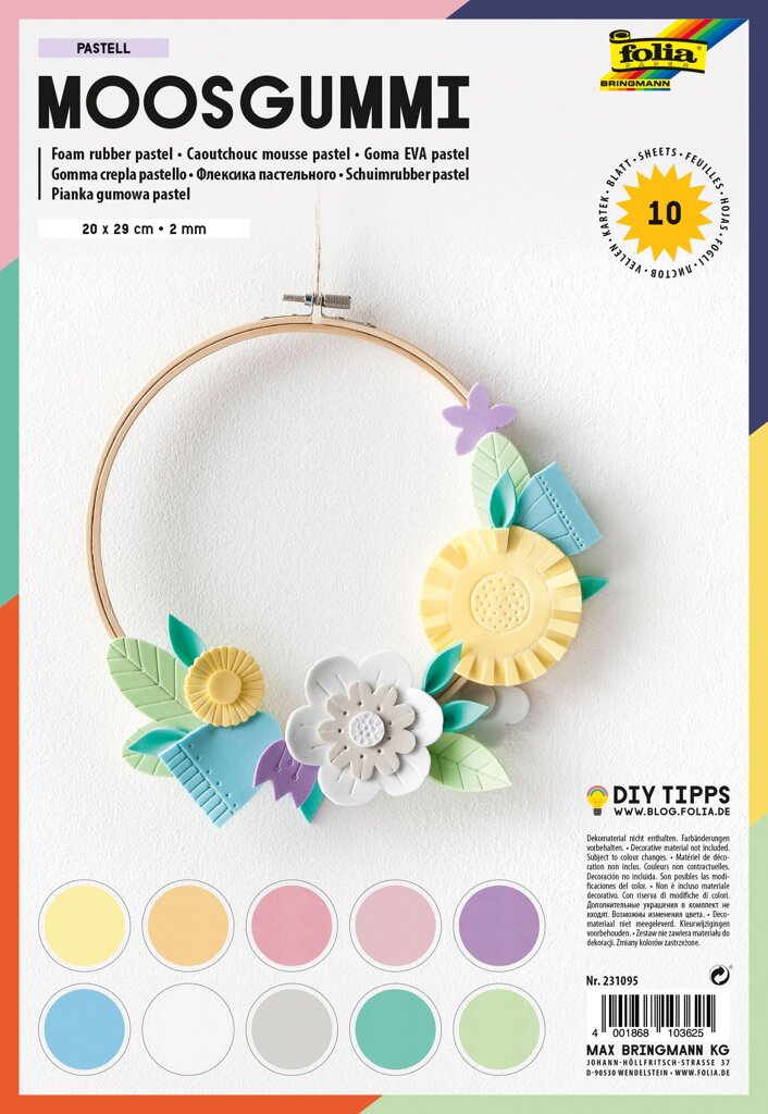 Penovka moosgummi - 10 listov, 10 farieb - pastel je určená na kreatívne tvorenie a výrobu dekorácií.