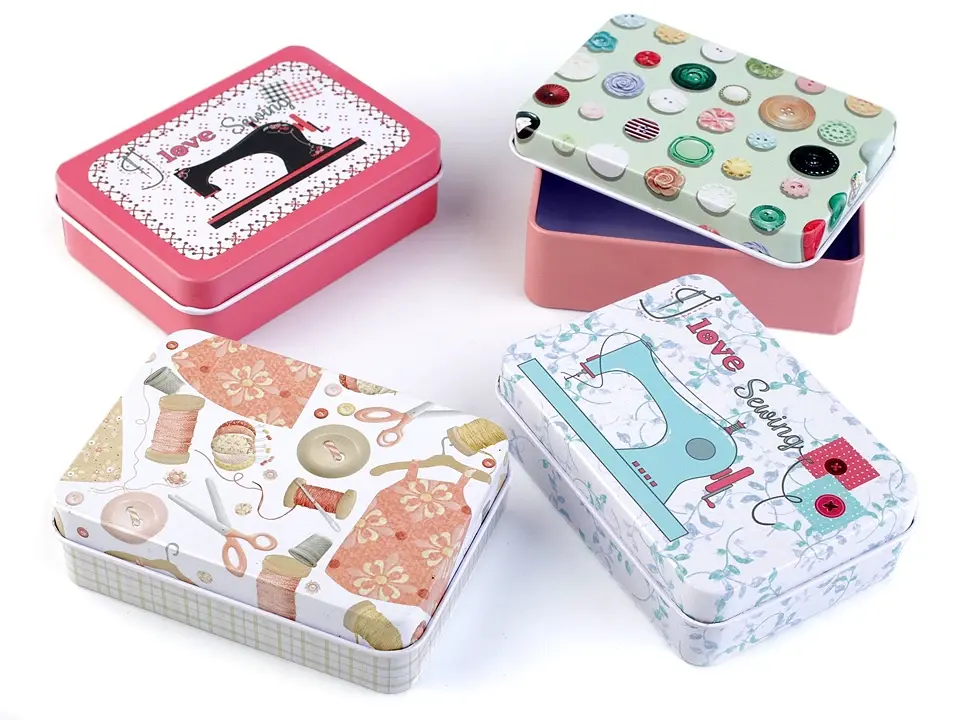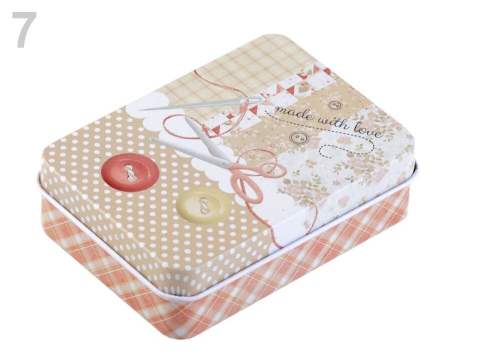 Užitočná plechová krabička, ktorú využijete na uloženie drobností. Malá plechová krabička Vás oslní svojim dizajnom a je predurčená na uloženie gombíkov, ihiel, nití a ďalšie drobné galantérie. Krabička má odnímateľné veko a hranatý tvar. Krabička sa stane ako ozdobou, tak užitočným pomocníkom. Krabička môže byť aj milým darčekom pre každú ženu.