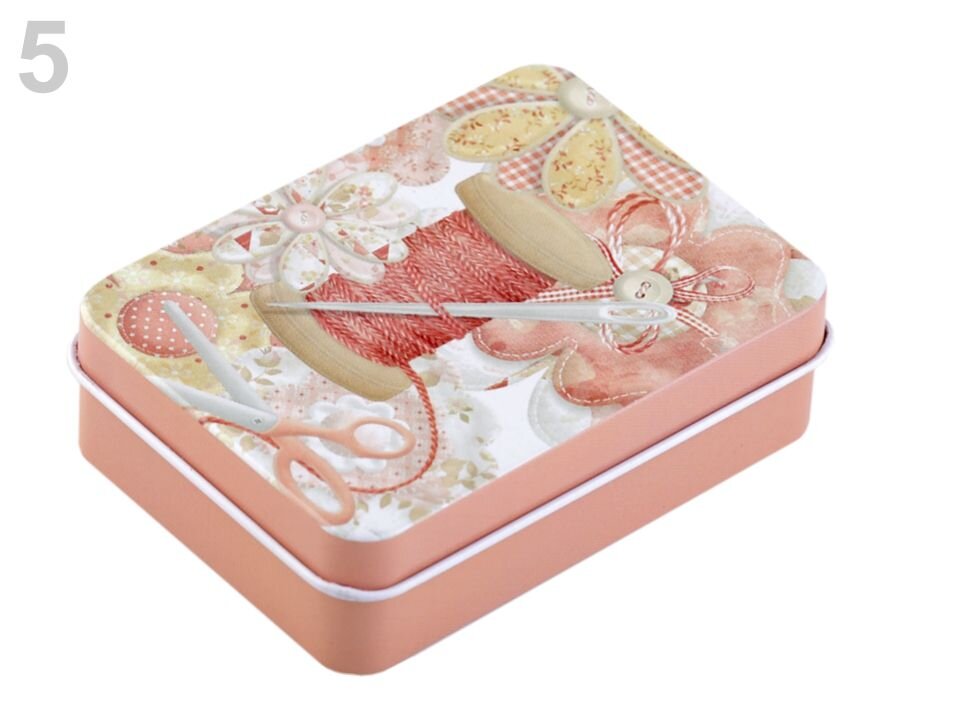 Plechová krabička s pekným dizajnom vhodná na uloženie drobných šijacích potrieb, napr. špendlíkov, ihiel, cievok a ďalšie galantérie.