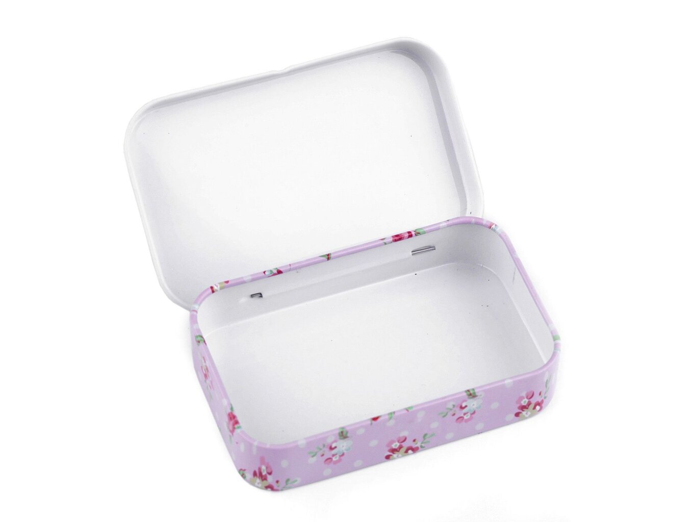 Plechová krabička s dizajnom ruží je vhodná na uloženie drobných šijacích potrieb, napr. špendlíkov, ihiel, cievok a ďalšie galantérie.