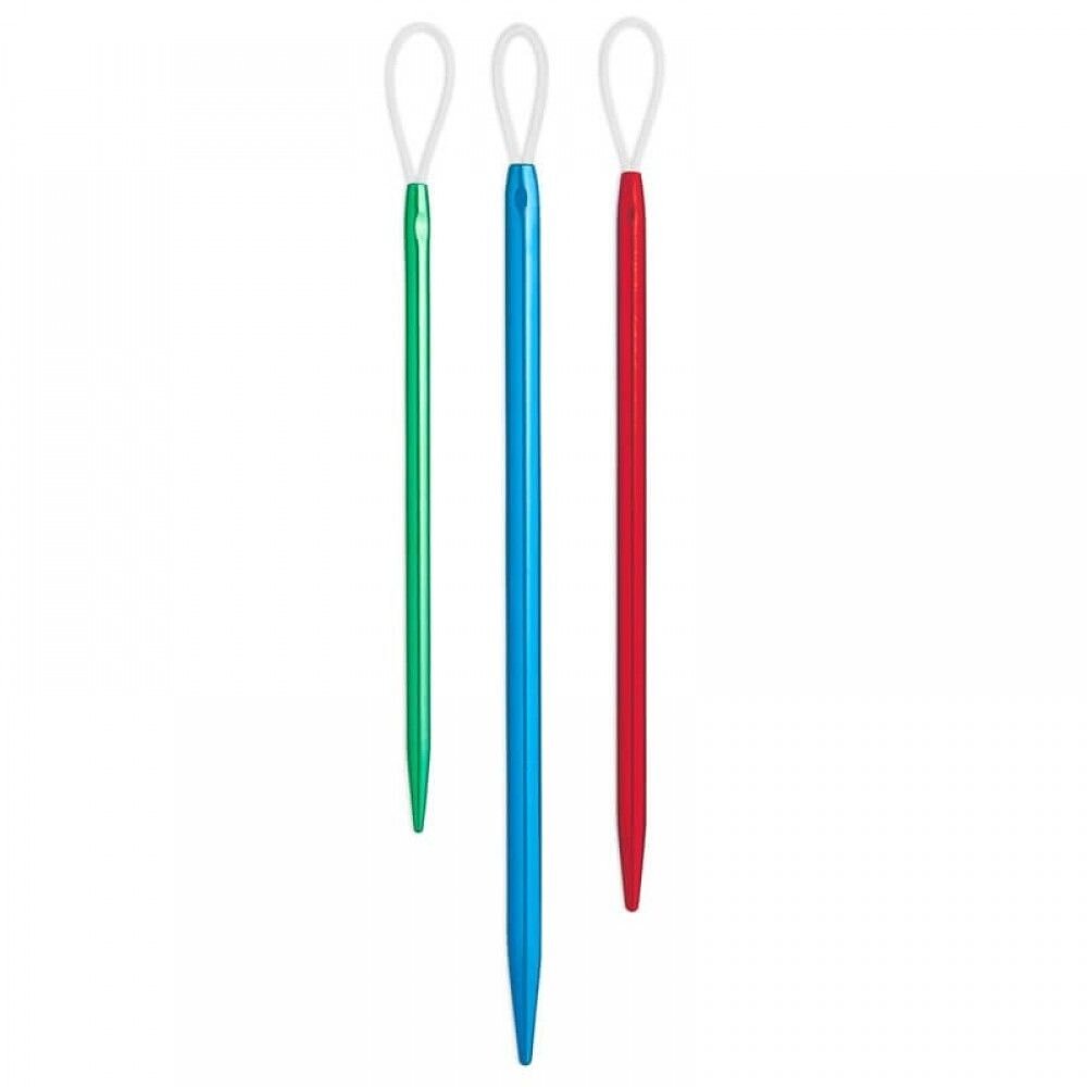 Pomocné ihly s veľkým očkom pre ľahké navliekanie silnejších priadzí. Nylónové očko je pružné a umožňuje ihlám ľahko prekĺznuť medzi stehmi. Zaoblená špička ihly chráni materiál pred poškodením. Ihly majú nízku hmotnosť a tak neunavujú ruku. Ihly sú skvelé pre prácu s pletacími strojčekmi, kytičkovačom a podobne. Ihly môžete využiť aj na vyšívanie. Súprava obsahuje 3 kusy ihiel v pútavých trblietavých farbách.