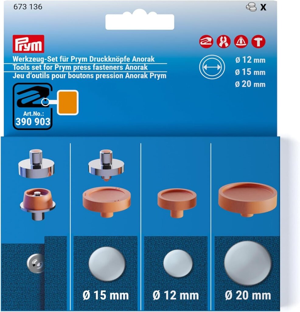 Prípravok na nitovanie cvokov ANORAK o veľkosti 12 mm, 15 mm a 20 mm, určený pre Vario Creative Tool od značky Prym. Sada nitovacích prípravkov.