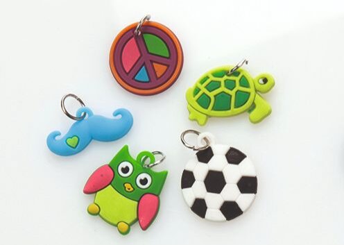 Přívěsky Rubber Loops se zábavnými dětskými motivy pro doplnění gumiček Rubber Loops nebo k dekoraci oděvů.