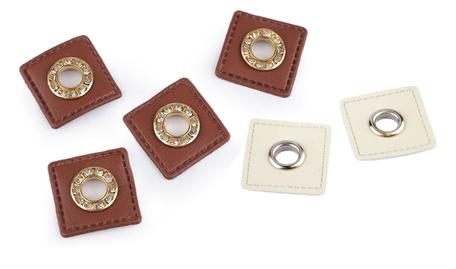Kovová průchodka s koženkovým čtverečkem určená pro našití. Efektivně ozdobí mikiny a bundy. Praktická a stylová průchodka.