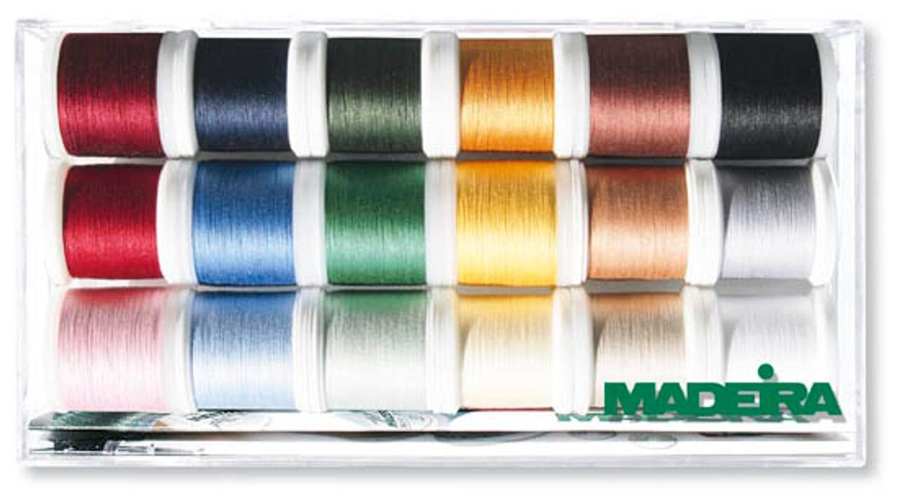Praktický box, ktorý obsahuje 18 ks kvalitných bavlnených nití Madeira Cotona č.30 v návine 200 m. Vyšívacia niť Cotona 30 sa používa aj ako horná efektná niť na quiltovanie a vyšívanie. Box je vyrobený z pevného priehľadného plastu.