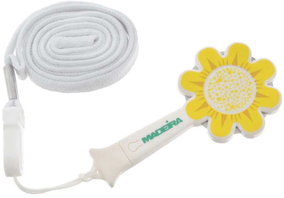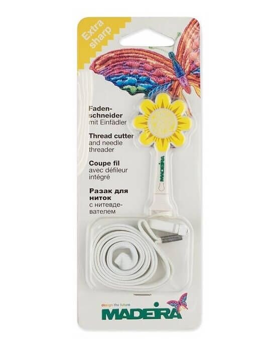 Rezač nití v tvare kvetu v ktorom je schovaný ostrý okrúhly brit, ktorý rýchlo a ľahko dokáže odrezať niť. Vnútri rezača nití je dokonca schovaný navliekač nití, takže máte všetky pomôcky pre prácu s niťou pekne po ruke. Vďaka šnúrke je možné si rezač Madeira dať na krk a mať ho stále po ruke.