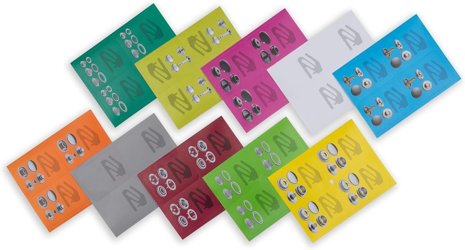 Rozlišovacie štítky na prehľadné usporiadanie cvokov Prym a nástrojov pre aplikáciu.