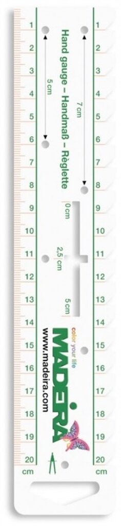 obchod@raj-sitia.skRučné merítko 20 cm - Madeira je praktická pomôcka každej krajčírky. Mierka je ohybná a tak ľahko priľne k materiálu a zaručí tak presné meranie. Ohybné meradlo. Vďaka zárezom v pravítku, bude poznačenie prídavkov na švy hračka.