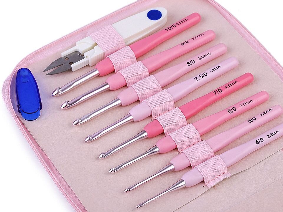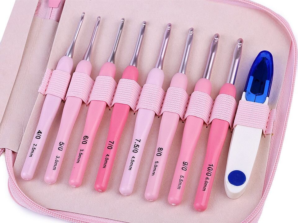 Ružová sada háčikov na háčkovanie v rôznych veľkostiach s odstrihávacími nožnicami v praktickom puzdre na zips. Praktická sada skvelá aj ako darček.