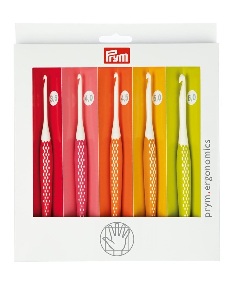 Sada háčikov na háčkovanie s ergonomickou rukoväťou - PRYM obsahuje háčiky vo veľkostiach 3,5/4/4,5/5/6 mm.