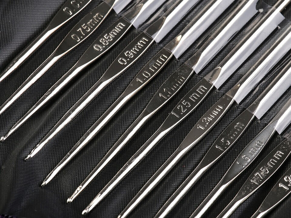 Sada obsahuje háčky ve velikosti: 0,5; 0,6; 0,75; 0,85; 0,9; 1; 1,1; 1,25; 1,3; 1,4; 1,5; 1,6; 1,75; 1,9; 2; 2,5; 3; 3,5; 4; 4,5; 5; 5,5; 6 a 6,5 mm.