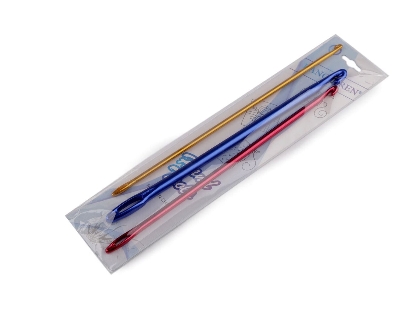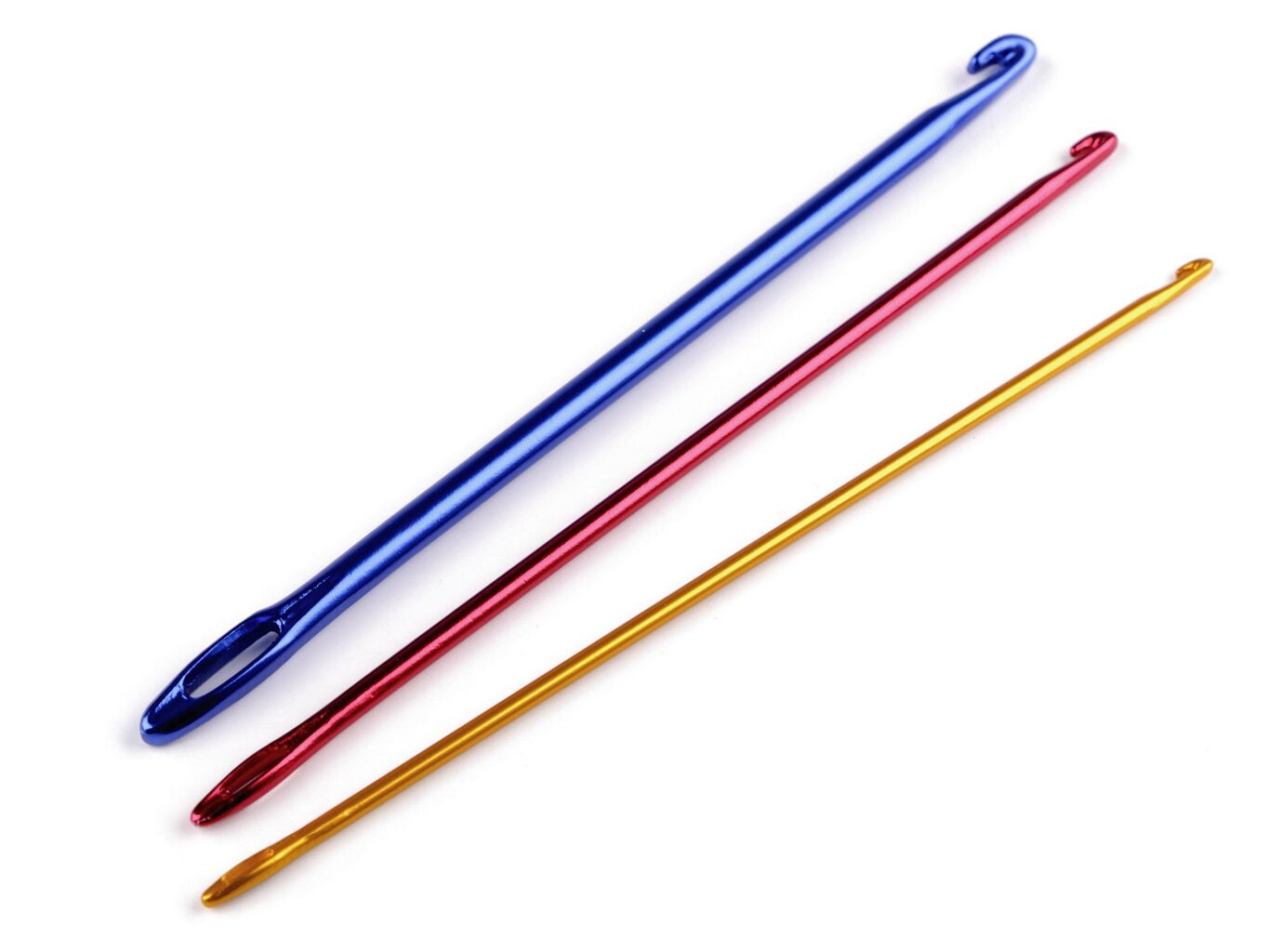 Sada 3 kusov háčikov s uškom, ktoré sú určené na knooking alebo pletenie na háčiku. Výsledný upletený vzor vyzerá rovnako ako výsledok pletený na ihliciach.
