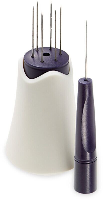 Ergonomický držiak na filcovanie alebo plstenie. Ide o dizajnovo premyslenú sadu rukovätí pre filcovacie ihly. Všestranný zatkávací pomocník na suché plstenie sa skladá z troch komponentov, ktoré si môžete ľubovoľne poskladať s plstiacimi ihlami. Súprava obsahuje držiak pre jednu ihlu, ktorú využijete pre detailnú prácu. Súčasťou je ďalej držiak pre šesť ihiel, ktorý je možné zložiť dohromady s držiakom jednej ihly a vytvoriť tak sedemihlovú zatkávaciu pomôcku pre ploché plstenie. Ochranný uzáver pre bezpečné skladovanie v balení samozrejme nechýba. Na zadnej strane obalu nájdete obrázkový návod. Držiak je vhodný pre ihly s dĺžkou 78 až 90 mm.