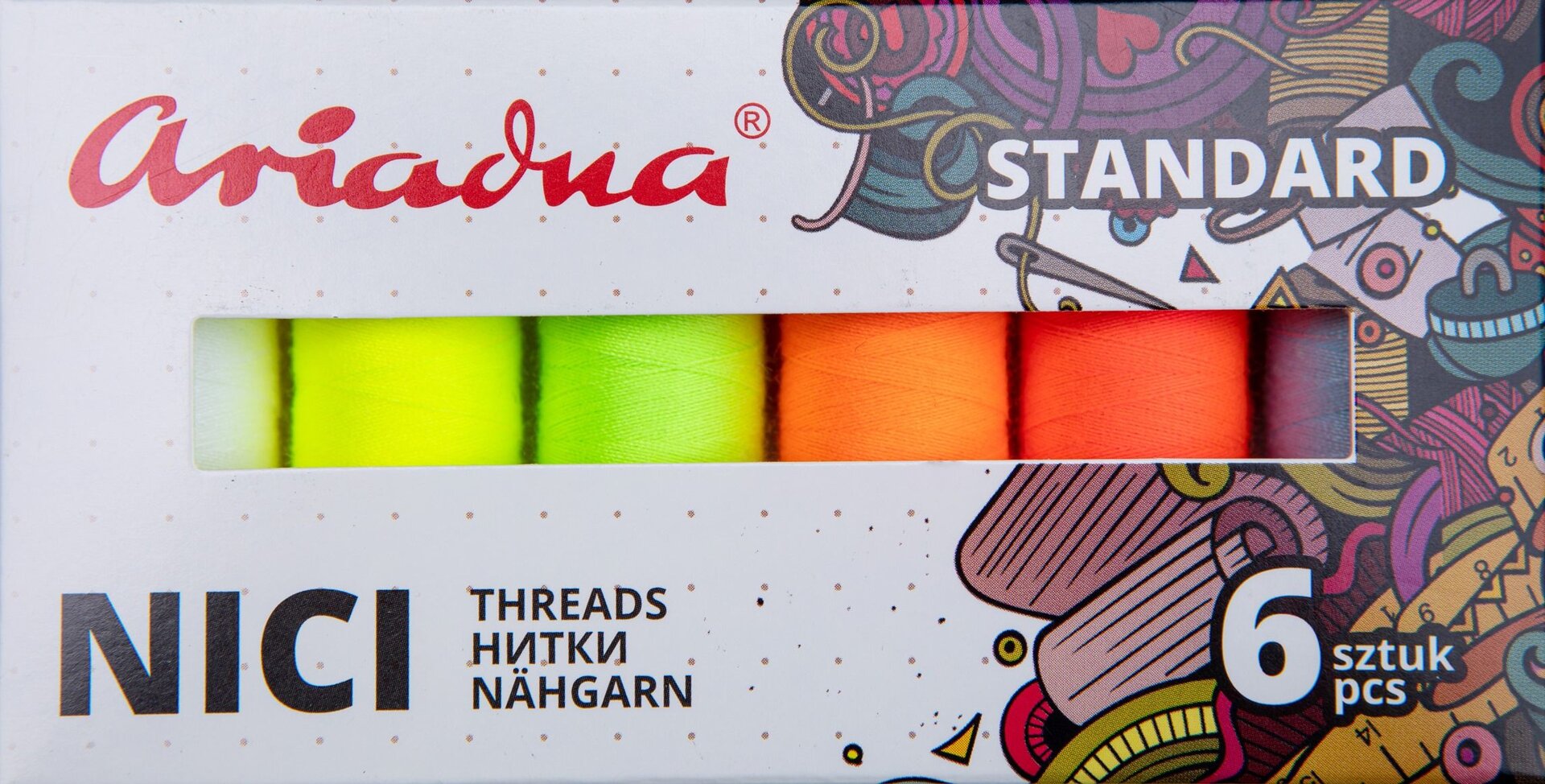 Sada výrazných - reflexných polyesterových nití Ariadna Talia, ktorá obsahuje 6 špulík po 200 metroch. Jedná sa o kvalitné nite európskeho výrobcu nití Ariadna. Šijacie univerzálne nite pre domáce i priemyselné šitie, s ktorými môžete šiť prakticky čokoľvek - ľahké dámske, pánske a detské odevy, spodná bielizeň jemné textílie, pletené výrobky, posteľná bielizeň. Nite môžeme odporučiť aj pre patchwork.