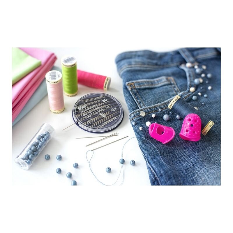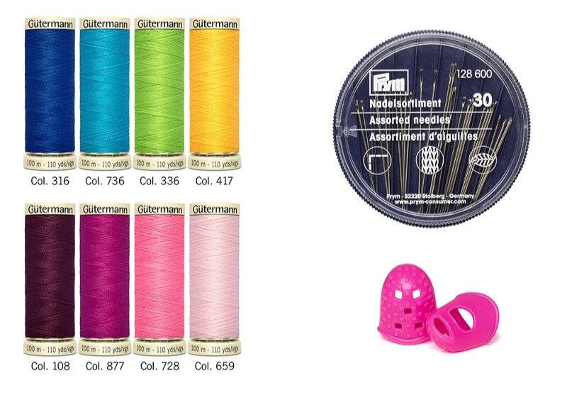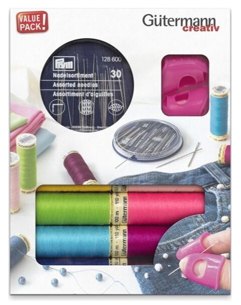 Praktická sada šijacích nití v sýtych farbách od značky Gütermann. Sada obsahuje 8 kusov nití v návine 100 m, taktiež 30 kusov ručných ihiel pre ručné šitie a vyšívanie od značky Prym v krabičke a 2 kusy protišmykových silikónových náprstkov. Sada je balená v papierovom obale zo 100% recyklovaného papiera.