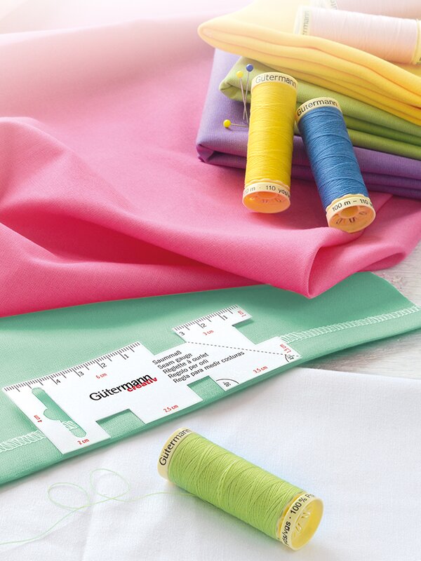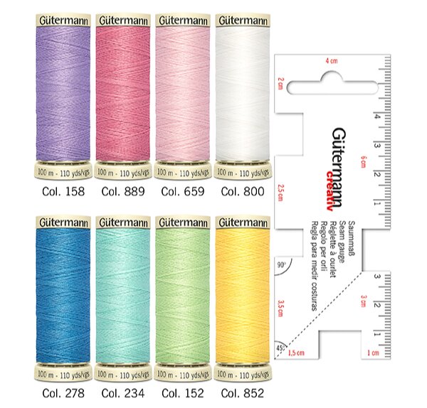 Praktická sada univerzálnych šijacích nití v trendy farbách od značky Gütermann. Sada obsahuje 8 kusov nití v návine 100 ma aj ručné meradlo. Ručné meradlo je praktická pomôcka na jednoduché a rýchle prenášanie prídavkov na švy a záložky. Sada je balená v papierovom obale zo 100% recyklovaného papiera.